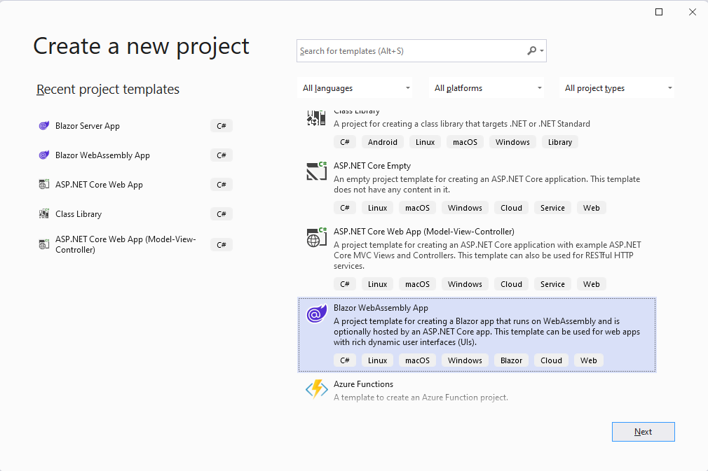 앞서 언급한 것처럼 Blazor가 호스트되는데는 모델에는 Server와 WebAssembly 2가지 방식이 존재합니다. 이 모델중 실제 어떤 모델을 선택할지에 대해서는 직접 2개의 기본적인 템플릿을 생성해 봄으로서 차이를 확인하면 알 수 있을 것입니다.