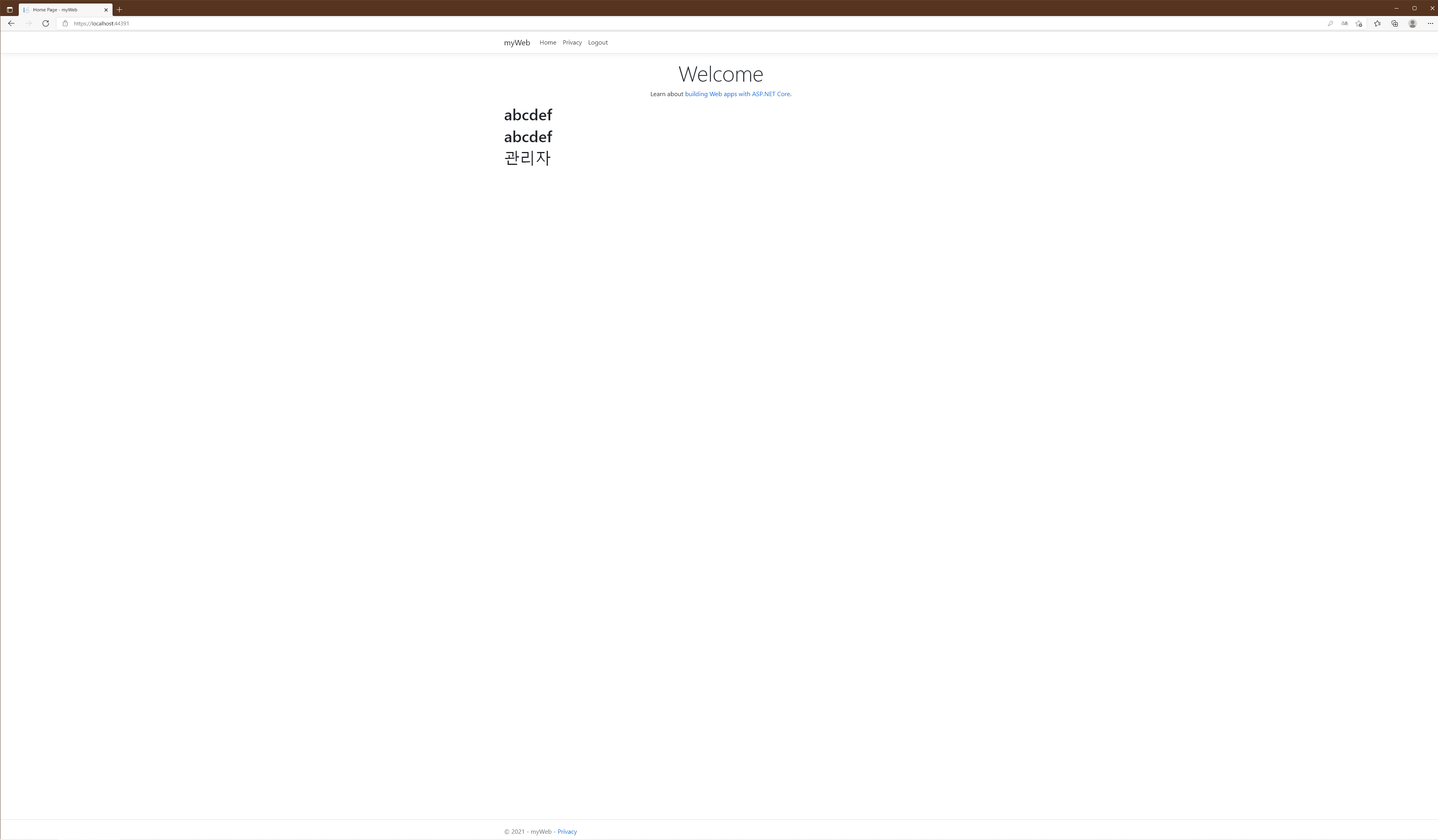 처음 Startup.cs에서 ConfigureServices() method에 option.AccessDeniedPath으로 Redirect 되는 경로를 지정했었는데 만약 Privacy()에 admin이 아닌 다른 권한을 가진 사용자가 접근하게 되면 AccessDeniedPath로 지정된 page가 대신 표시될 것입니다.