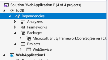 그리고 만들어진 project에 Microsoft.EntityFrameworkCore.SqlServer package를 설치하고 WebService를 참조 추가합니다. 또한 WebApplication1 project에서도 toDB project를 참조 추가합니다.