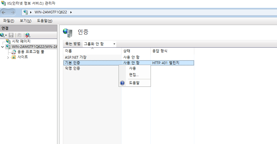 IIS의 '인증'에서 '기본 인증'을 '사용'으로 설정합니다. (주의 : 개별 '사이트'에 service중인 인증부분에도 '기본 인증'이 '사용'으로 전환될 수 있습니다. 하지만 server에만 적용되면 되는 설정으로 각 web service에 동일한 설정을 적용할 필요는 없습니다. 만약 이 설정이 web service에 적용된 상태라면 사용자가 해당 web service에 접속했을때 '인증'을 요구하는 화면을 마주하게 됩니다.)
