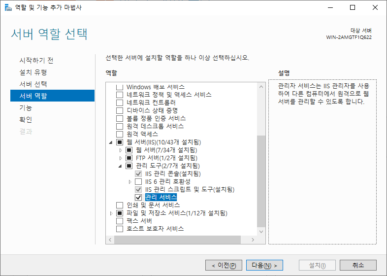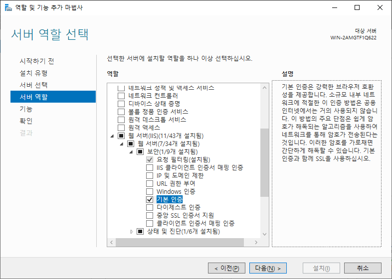 Web Server에서 아래와 같이 'IIS Mnagement Scripts and Tools(IIS 관리 스크립트 및 도구)'와 'Management Service(관리 서비스)' 역활 그리고 '기본 인증'을 추가합니다.