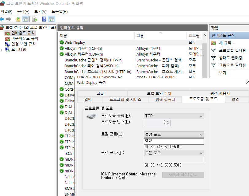 server의 방화벽을 설정해 '안바운드'와 '아웃바운드'모두 8172 port를 개방하도록 합니다.