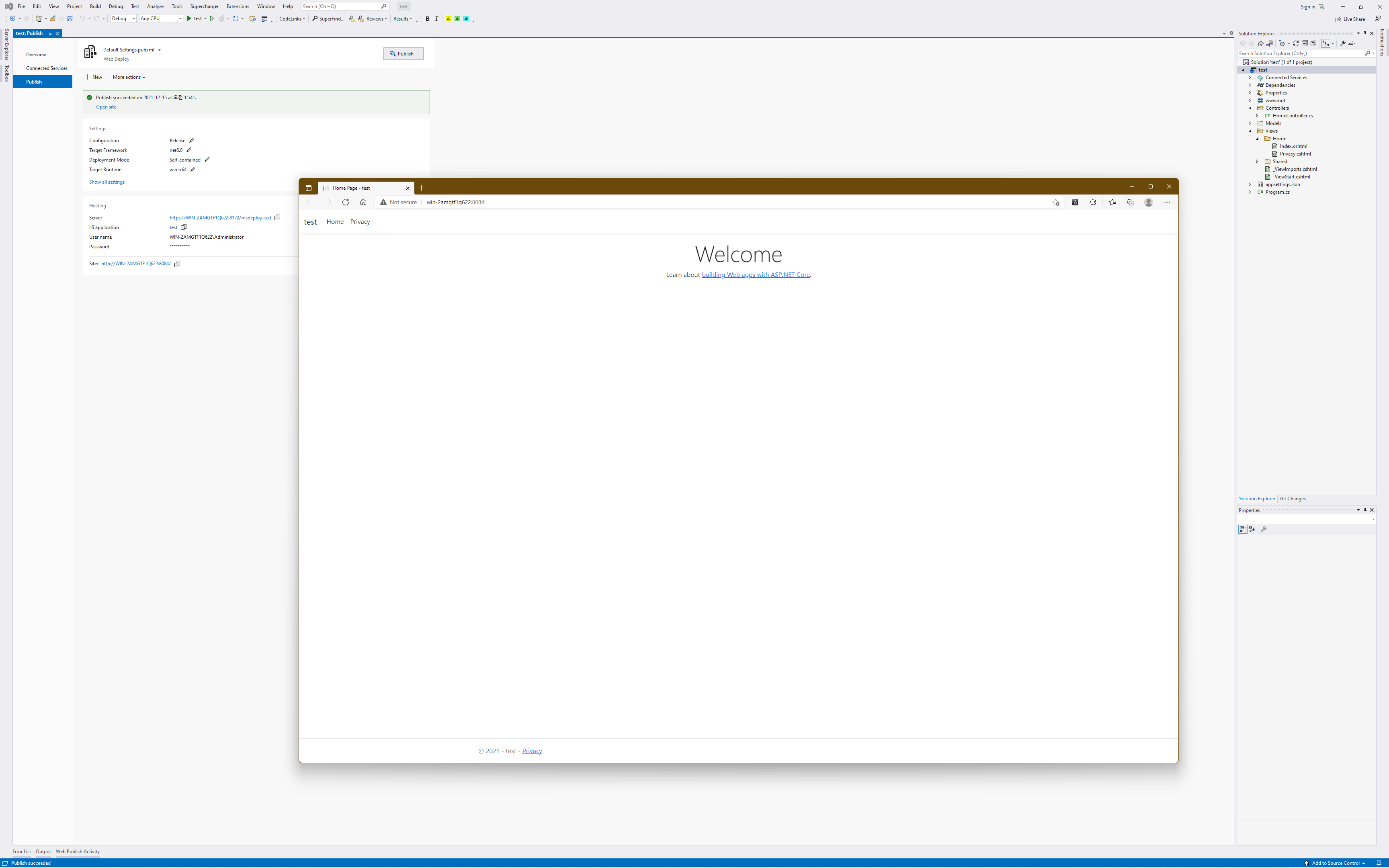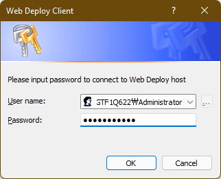 필요에 따라 상세 배포설정을 진행한 뒤 배포를 시도하면 해당 계정의 비밀번호를 묻는 화면이 나오게 되고 비밀번호를 입력하면 IIS로 곧장 배포가 진행될 것입니다.