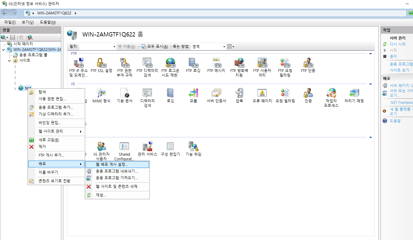 1과 2과정을 끝내고 IIS에서 배포할 Web Service를 선택한뒤 mouse오른쪽 button을 누르게 되면 '배포 -> 웹 배포 게시 설정'menu를 볼 수 있습니다.