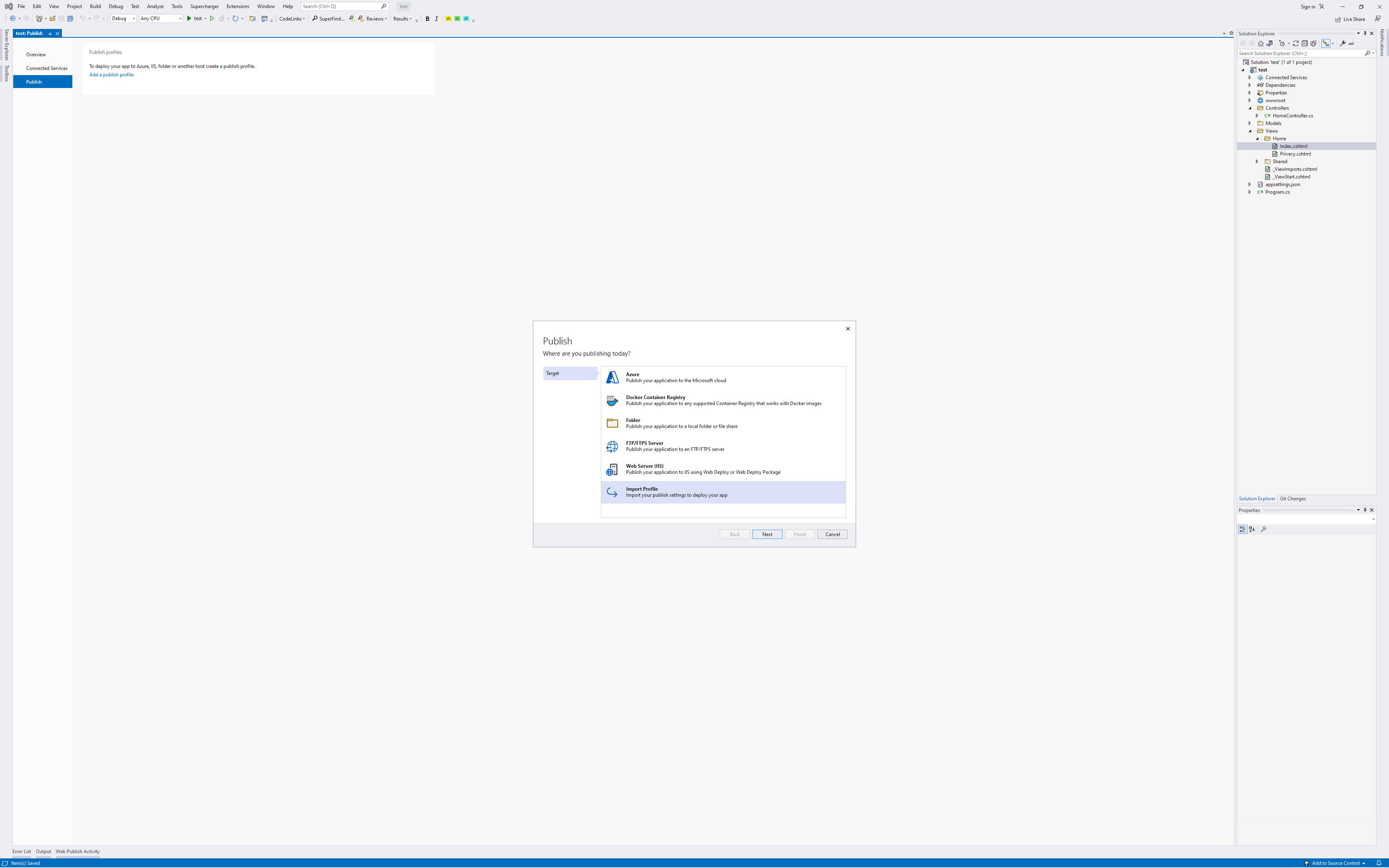 Visual Studio에서 project의 배포를 설정해야 하는데 이때 'Import Profile'로 선택하여 진행합니다.