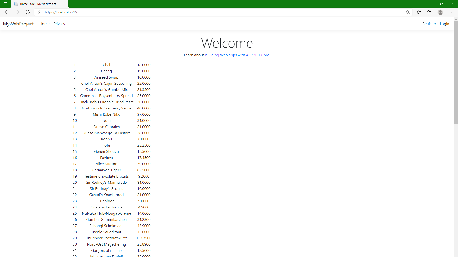ProductDetail Action 메서드는 Product의 ID값을 받도록 되어 있으므로 Index.html에서는 아래와 같이 a link 태그를 추가해 줍니다.