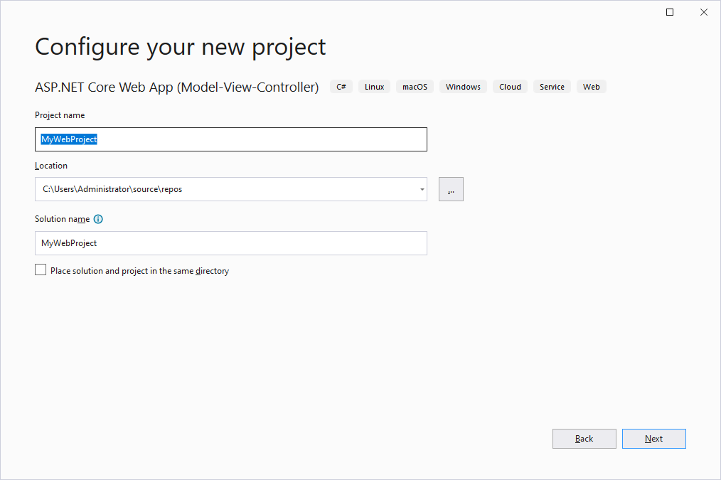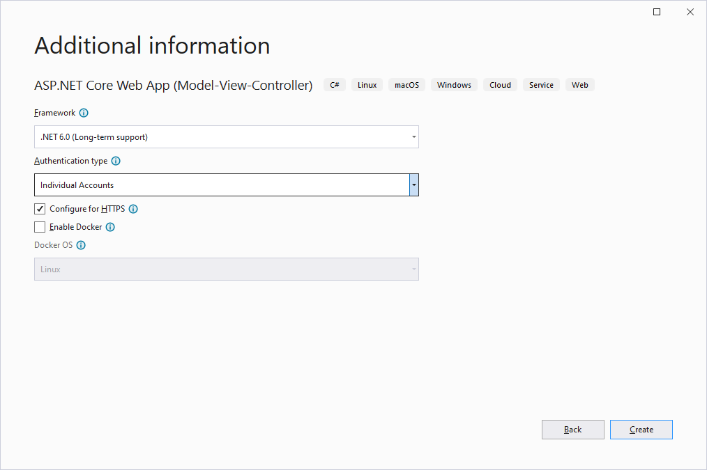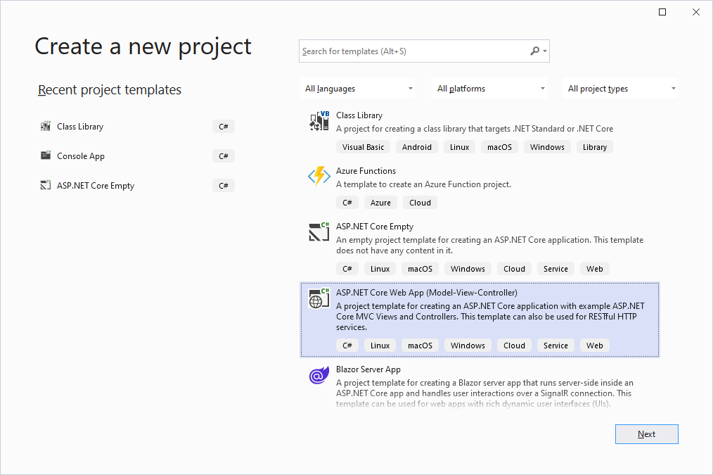 Visual Studio 2022를 실행하고 ASP.NET Core Web App (Model-View-Controller) 템플릿을 선택합니다.