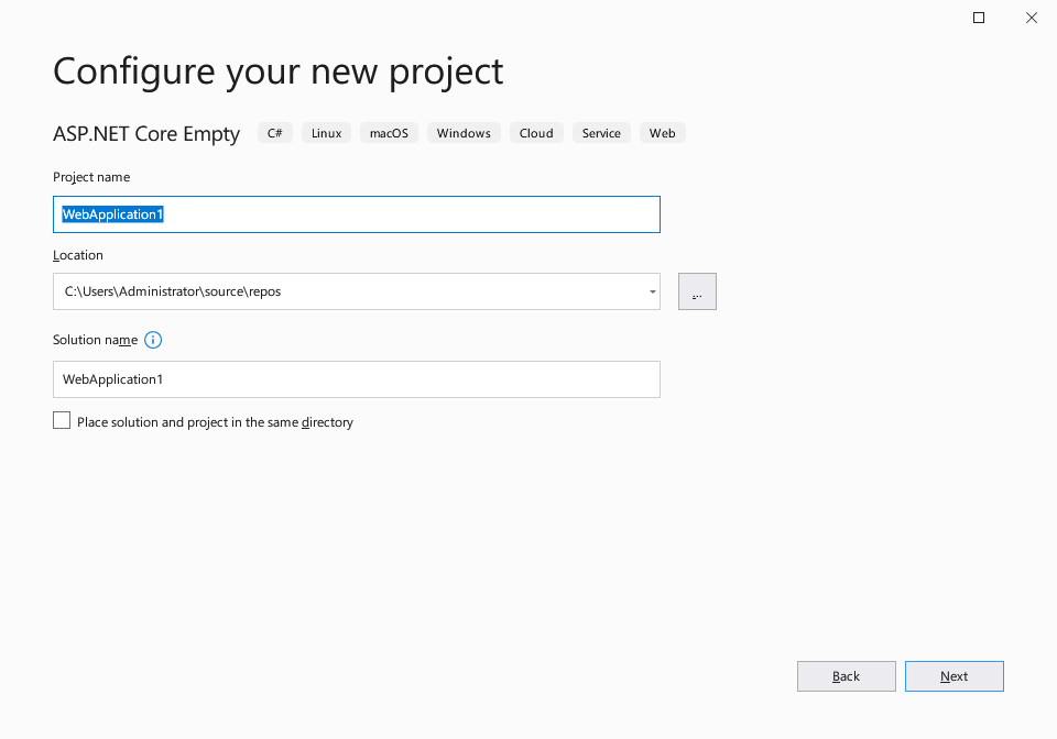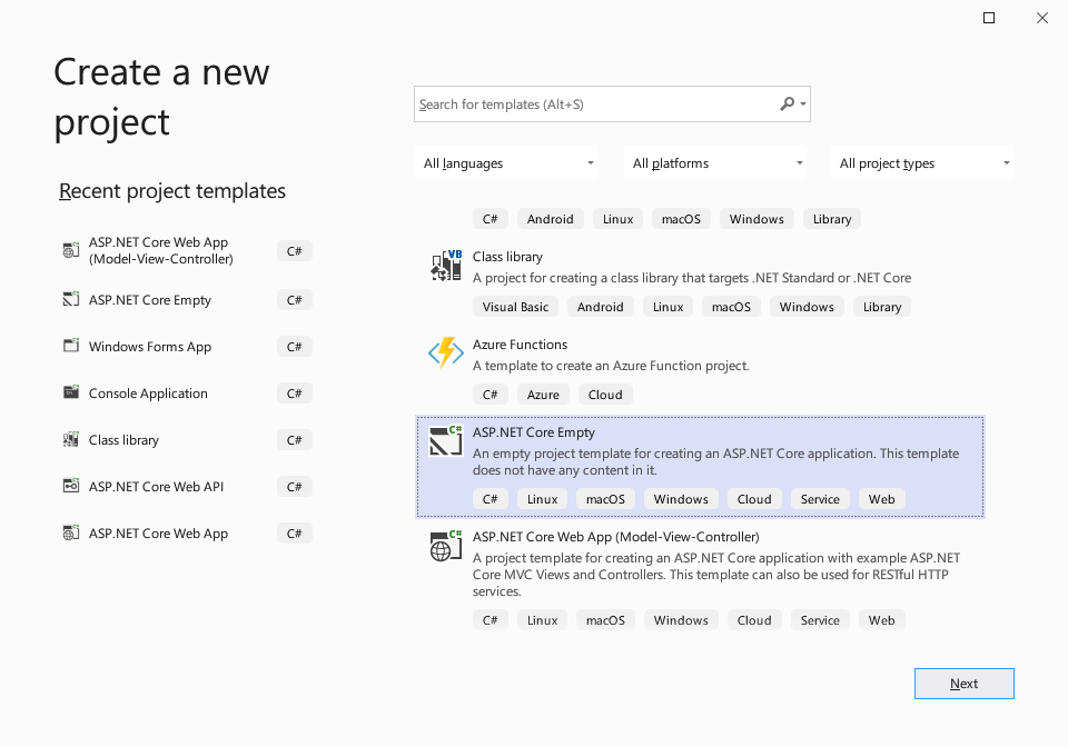 Visual Studio 2019를 시작해 새 project에서 'ASP.NET Core Empty'를 선택합니다.
