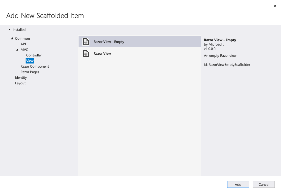 Razor View - Empty로 Index.cshtml이라는 새로운 View file을 생성합니다. View는 실제 사용자가 화면으로 보는 page입니다.