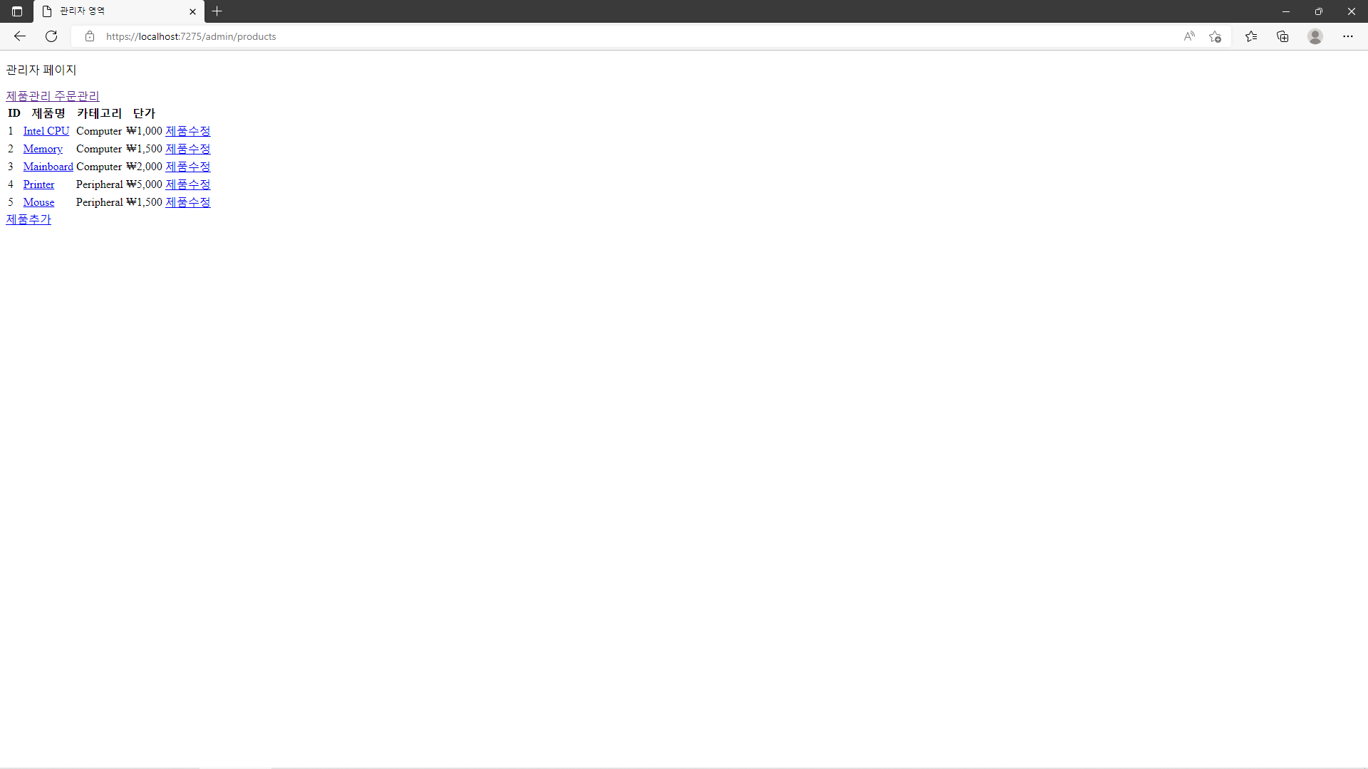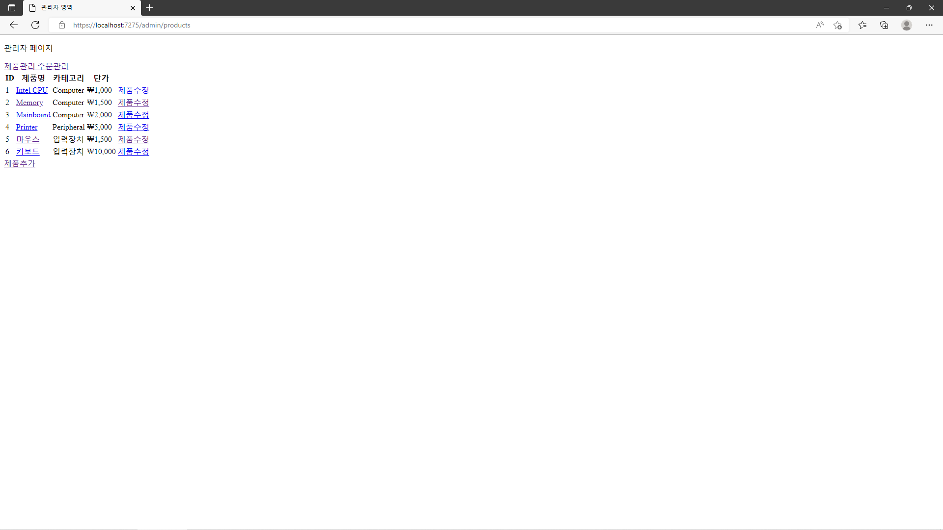 project를 시작해 /admin/products로 이동하여 정상적으로 화면이 표시되는지를 확인합니다.