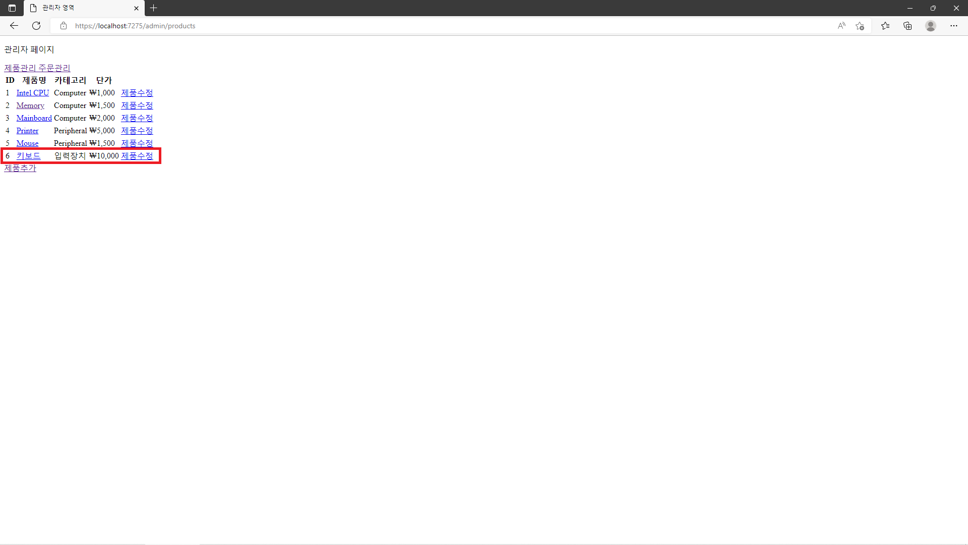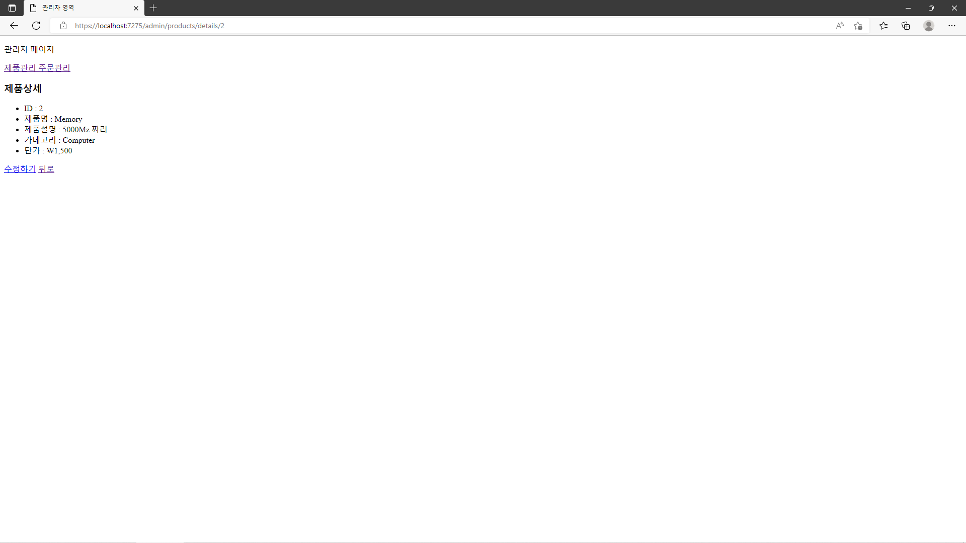 그리고 다시 기존에 존재하는 Product 중 하나를 골라 '제품 수정'을 눌러 해당 Product의 값을 변경한 후