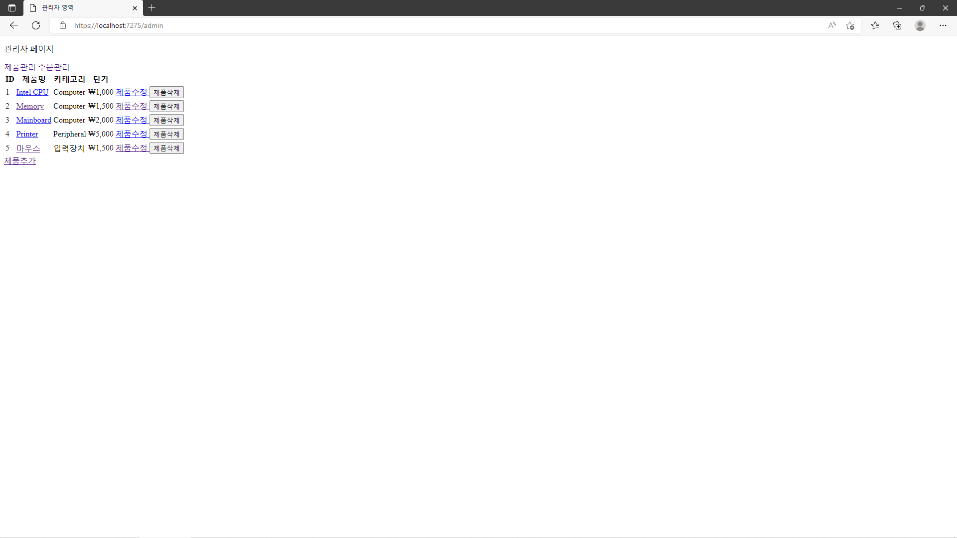 Project를 다시 실행하여 새롭게 추가된 Button을 사용해 제품이 성공적으로 삭제되는지의 여부를 확인합니다.