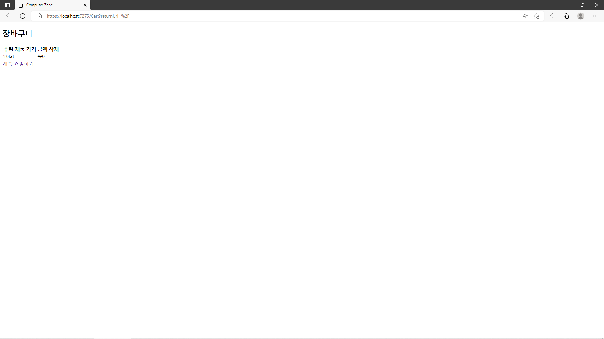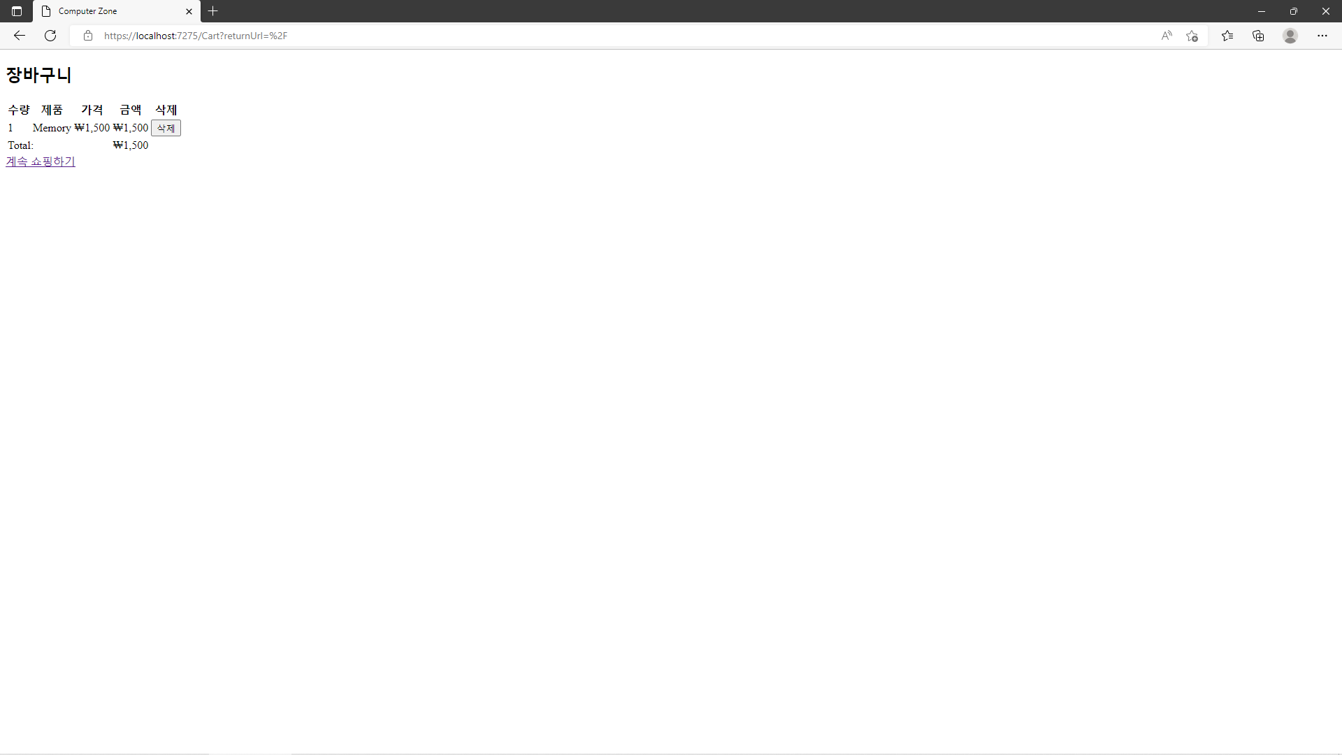 사용자가 Cart에 추가된 Item을 제거하려면 Cart Razor Page에서 삭제에 필요한 Button을 표시하여야 할 것입니다. 따라서 다음과 같이 Cart.cshtml을 수정합니다.