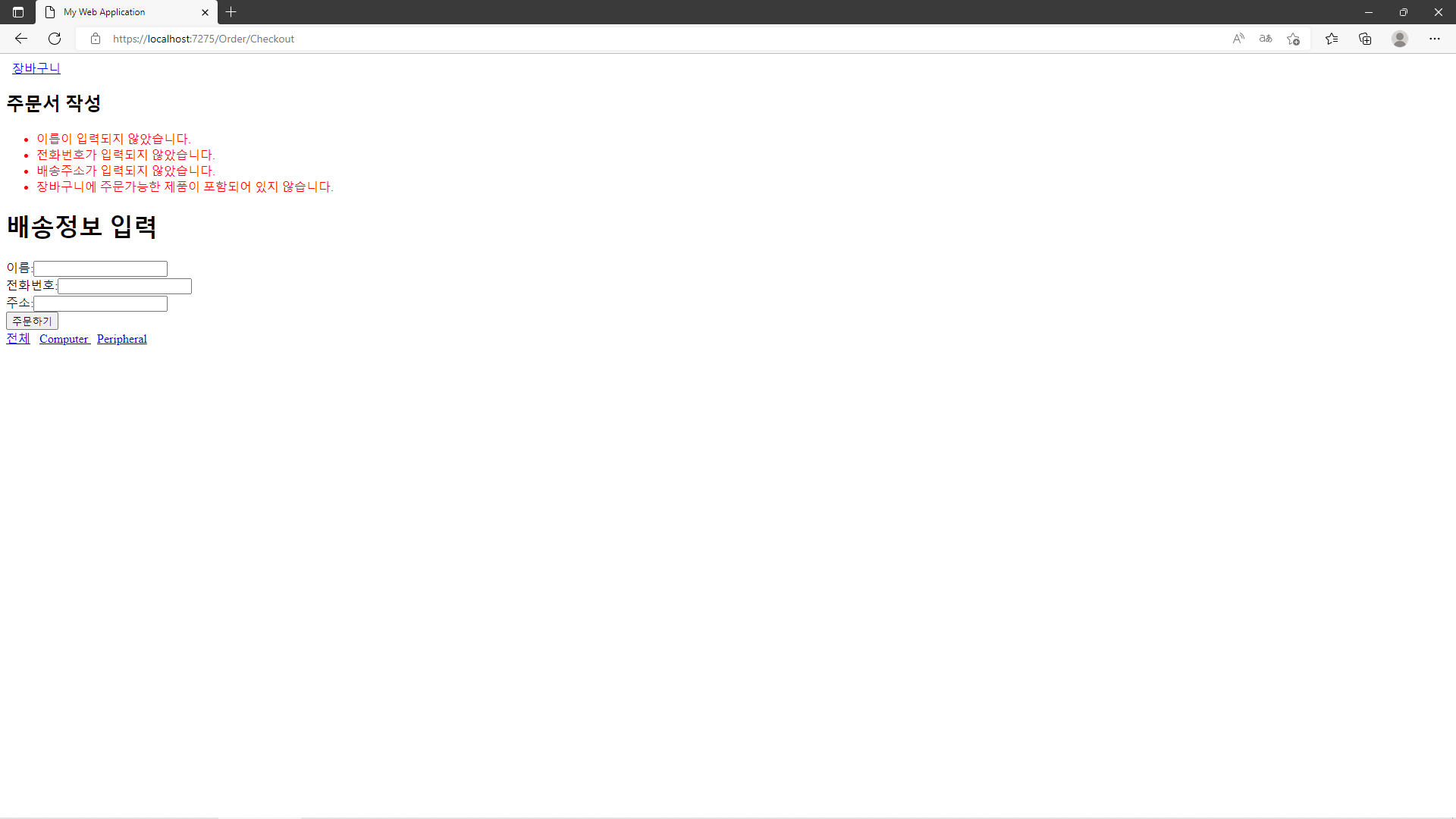 project를 실행하여 /order/checkout으로 이동해 아무런 값도 입력하지 않고 '주문하기'button을 눌러 아래와 같이 Model validation이 작동하는지를 확인합니다.