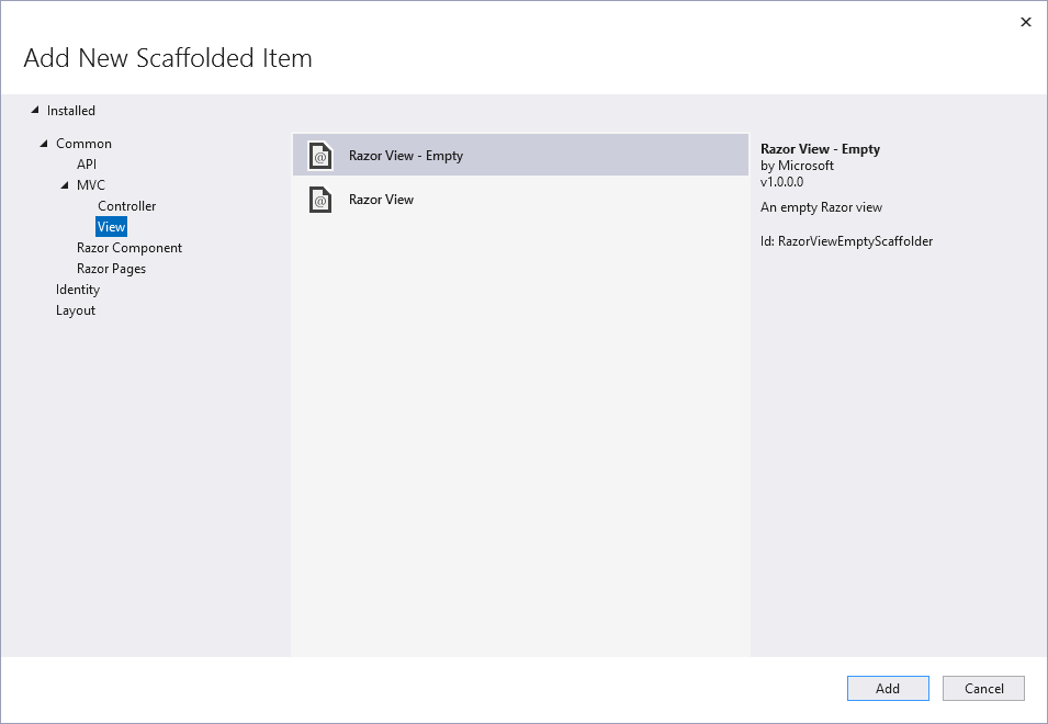 Name부분에 'Order.cshtml'을 지정하고 'Add'를 눌러주면 project의 Views folder에 Order라는 folder를 생성하고 그 안에 Checkout.cshtml이라는 file을 자동으로 생성할 것입니다.