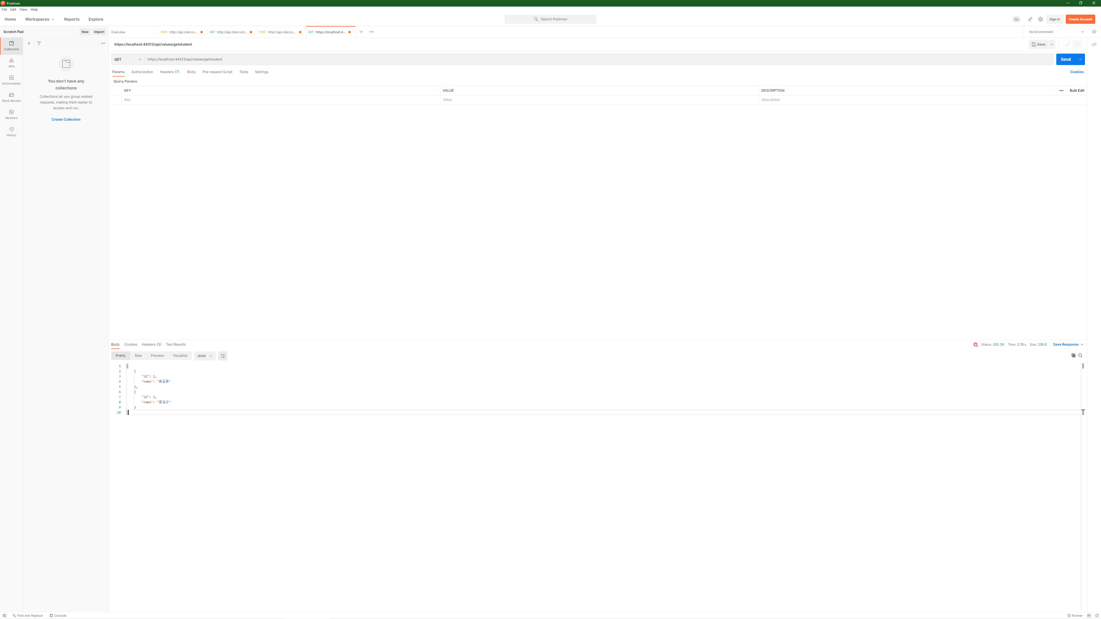 ASP.NET Core Web API에서는 기본적으로 데이터를 json으로 내보내도록 되어 있으므로 위 메서드를 요청하면 json타입의 데이터를 받게 됩니다.