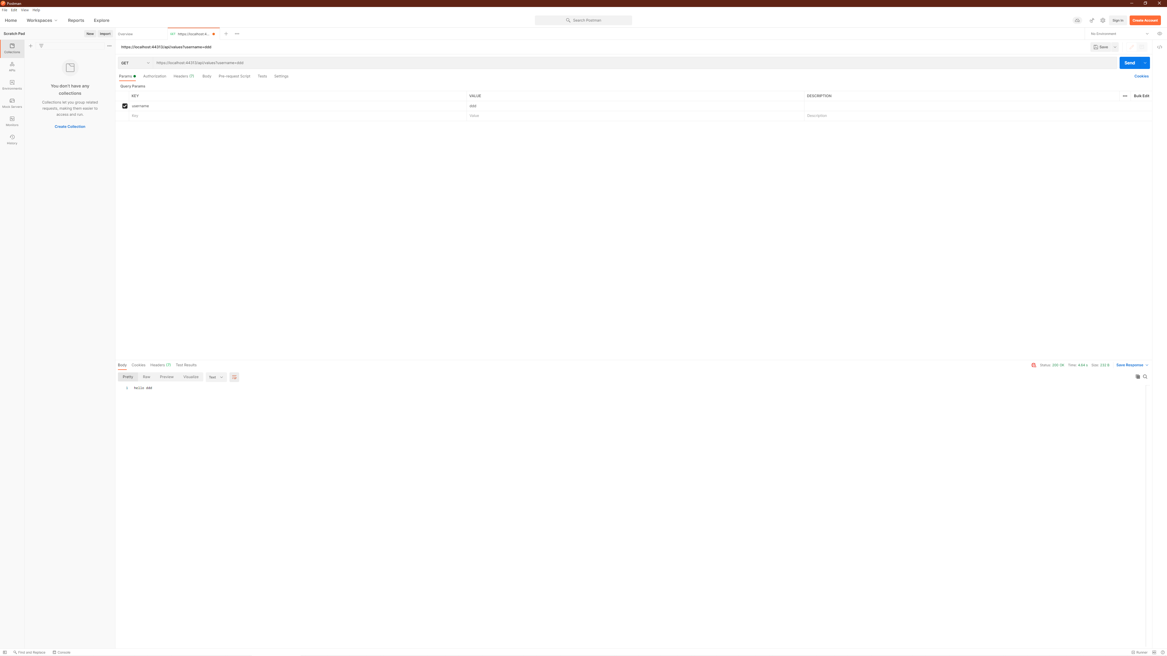 매개변수는 /다음에 필요한 값을 URL에 입력해 전송합니다. 매개변수가 없으면 Get() 메서드가 요청을 받아 'Hello'를 출력하지만 매개변수가 존재하면 Get(int id) 메서드가 받아 'Parameter : '로 URL에 전달된 매개 변숫값을 출력하게 됩니다.