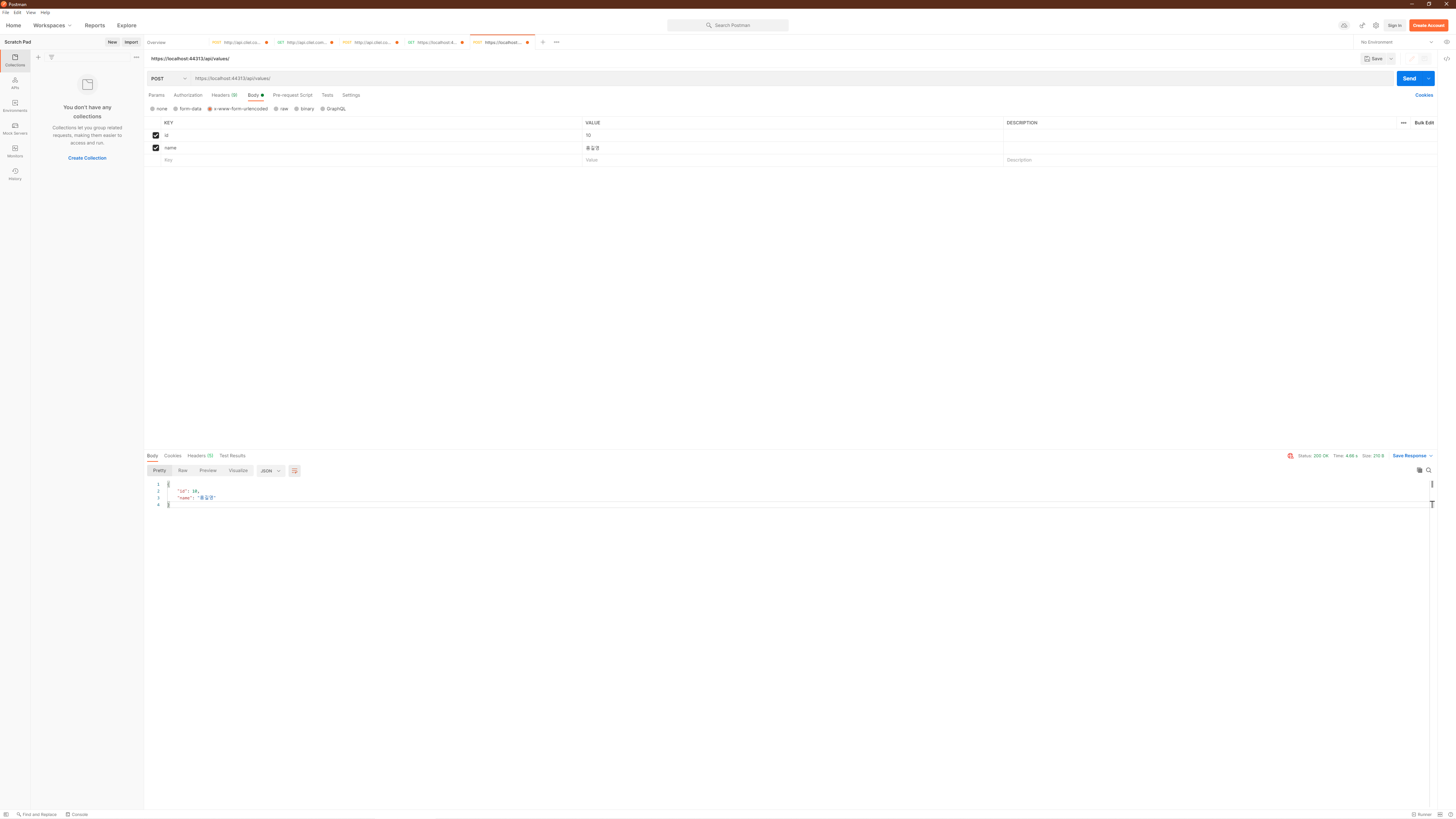 HttpPost 어트리뷰트가 적용된 AddStudent() 메서드는 stdent형식의 데이터를 Post로 전달받아 이를 토대로 새로운 student 객체를 생성한 뒤 해당 인스턴스를 다시 반환하도록 하고 있습니다. AddStudent() 메서드는 별도의 Route가 설정되지 않았으므로 values 컨트롤러로 Post를 수행하면 현재까지 Post요청을 받는 유일한 메서드인 AddStudent() 메서드를 호출하게 될 것입니다.