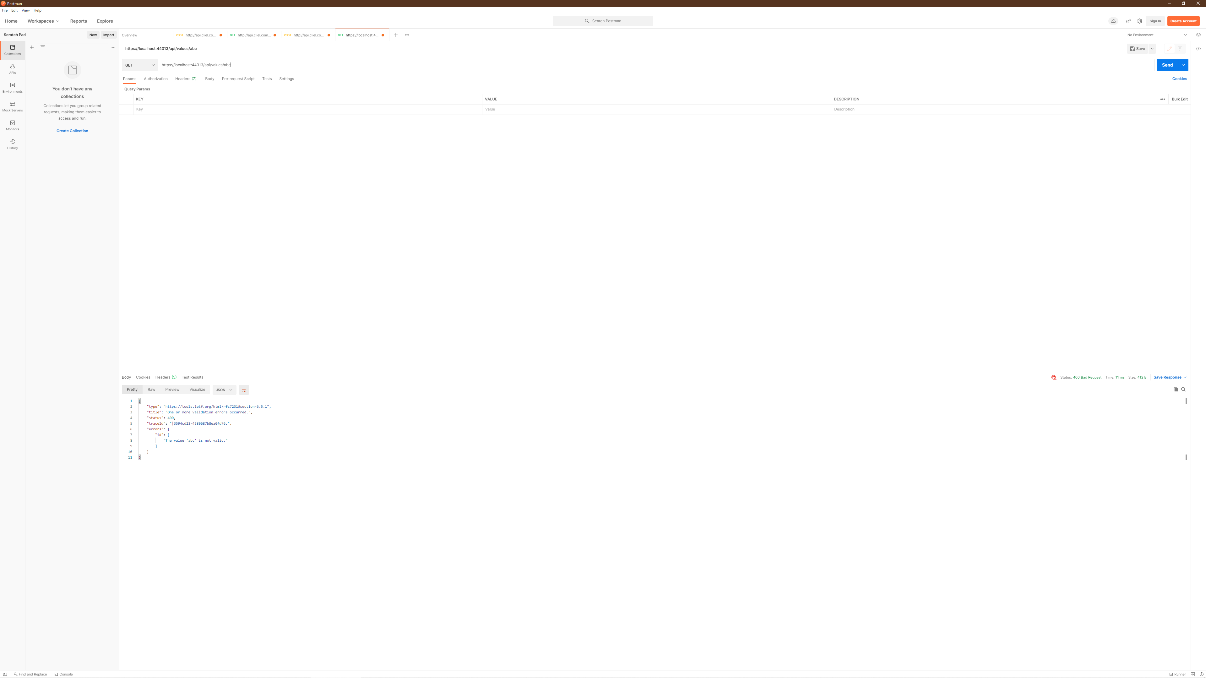 새롭게 추가한 Get(int id) 메서드는 URL에 전달된 매개변수를 id라는 변수로 받아서 출력하고 있는데 해당 변수는 int형으로 정의되어 있습니다. 이 말은 매개 변숫값이 int형의 데이터만 받을 수 있다는 것을 의미하는데 만약 데이터 자체를 int가 아닌 'abcdef'와 같은 string형식으로 전달하게 되면 'abcdef'은 int형으로 표시할 수 있는 데이터가 아니기에 400 Bed Request 오류를 발생시키게 됩니다.