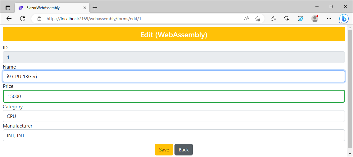 예제에서는 이전에 생성한 어떠한 사용자 정의 select component나 validation component도 사용하지 않았습니다. project사이에서 component를 공유하는 것은 특히 Blazor WebAssembly를 개발이 시작된 후에 도입할 때 다소 어려운 면이 있습니다. 이 것은 향후 release에서 개선될 거라 예상되지만 해당 예제에서는 가급적 쉽게 끝낼 수 있도록 하였습니다. 위 예제는 결과적으로 종전 project와 다르게 select요소가 값이 선택될 때 trigger 되지 않으며 submit button은 자동적으로 disable 되지 않고 category와 manufacturer의 조합에 대한 어떠한 제약도 존재하지 않습니다.
