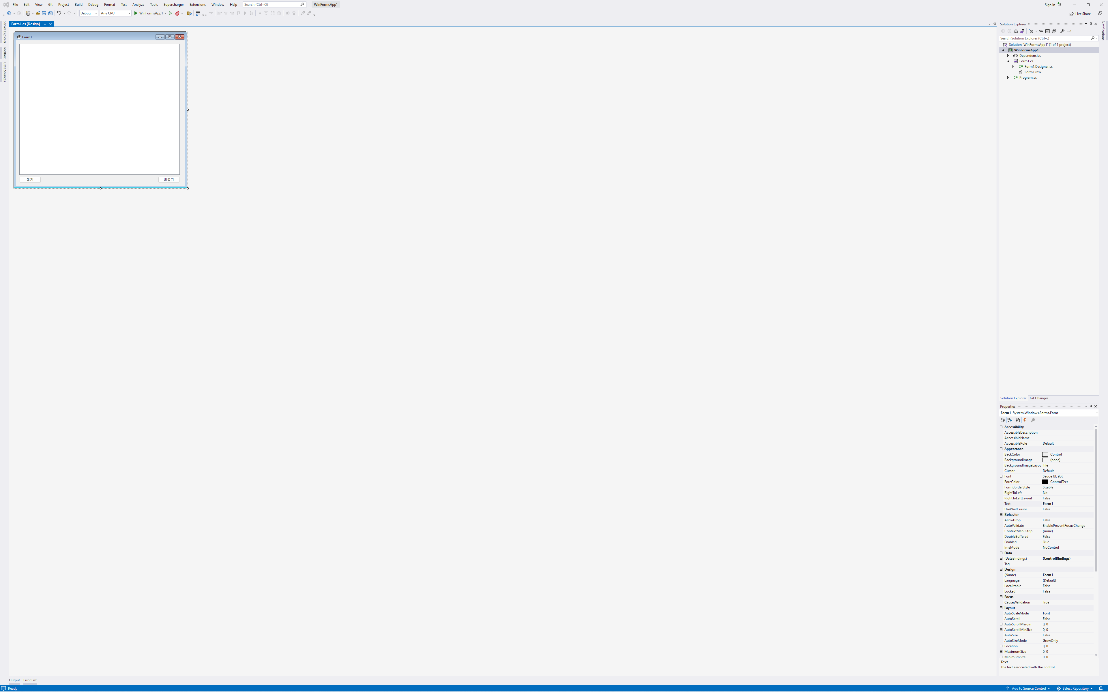 async와 await를 사용해 보기 위해 Visual Studio에서 Windows Forms App프로젝트를 생성합니다. 이 프로젝트는 Nothwind DB로부터 Products테이블의 내용을 가져와 보여주는 간단한 형태의 Windows App입니다. 프로젝트가 생성되면 다음과 같이 하나의 ListView과 Button2개로 Form을 디자인합니다.