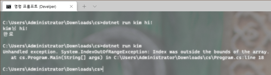 string greeting = args.Length == 2 ? args[1] : throw new Exception("배열 범위를 벗어남");