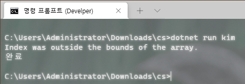 예제에서는 args매개변수를 통해 2개의 문자열을 구분해 처리하고 있습니다. 프로그램을 보면 문자열 값이 무조건 2개는 들어온다는 가정하에 만들어진 것으로 소스상으로는 아무런 문제가 없지만 사용자가 프로그램 실행 시 문자열 값을 하나만 주는 경우라면 예외가 발생하게 될 것입니다.