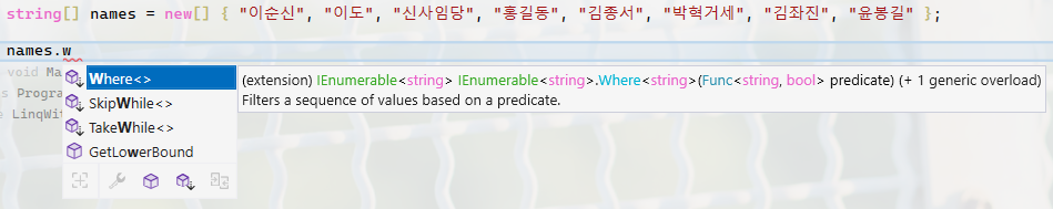 그리고 Program.cs에서 names에 Where 확장 method를 호출하도록 합니다. 이때 Where를 입력하기 위해 typing울 시도하면 아래와 같이 IntelliSense에 의해 array에서 사용가능한 member들이 표시되는데