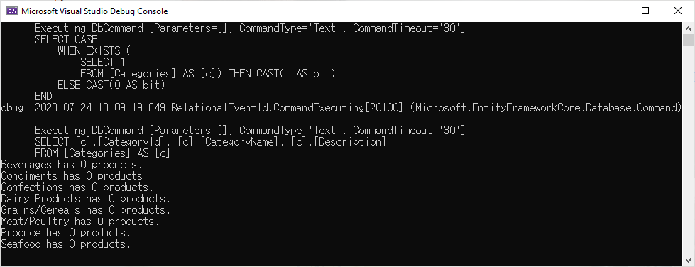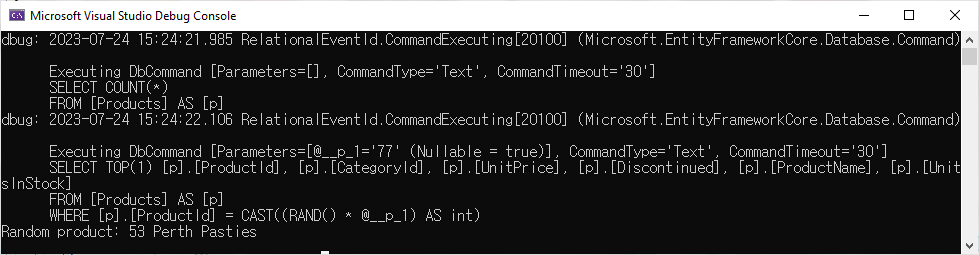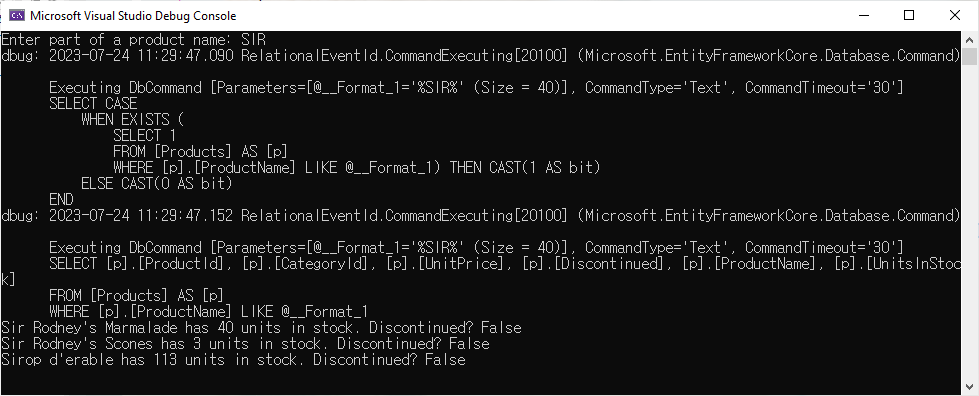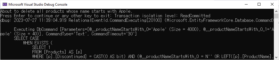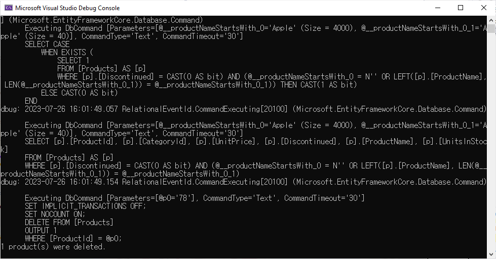 Program.cs에서 DeleteProductsBetter method를 호출하도록 하고 예제를 실행하면 다음과 같은 결과를 표시할 것입니다.