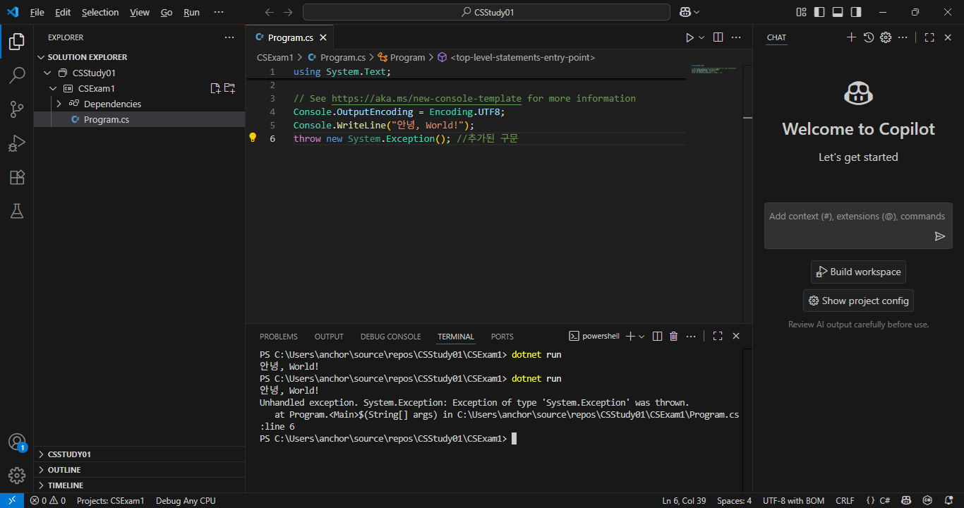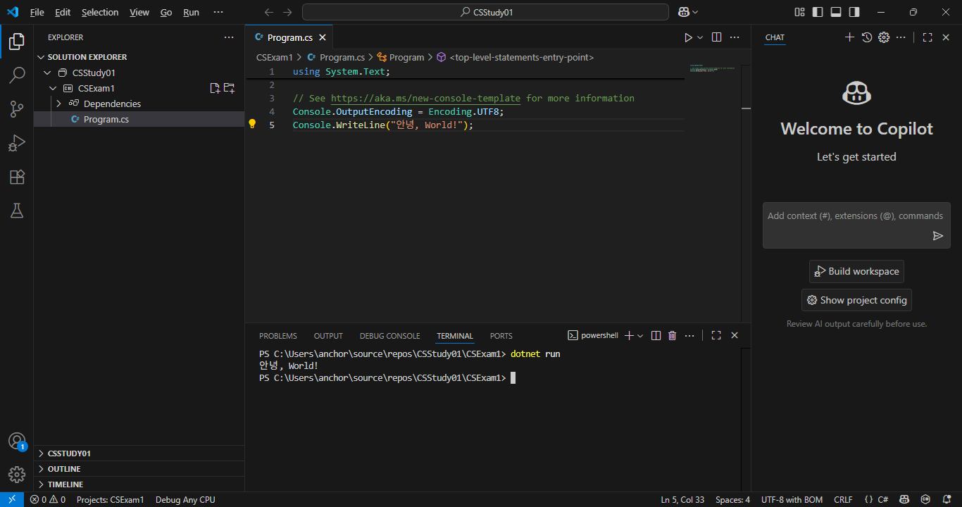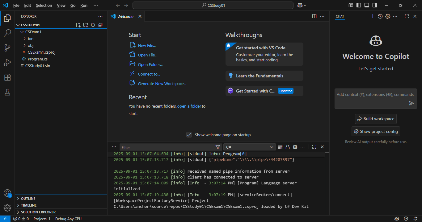 예제의 실행을 통해 예제의 실행파일이 debug\net9.0\CSExam2.exe로 실행된다는 것을 알 수 있습니다. 하지만 이 경로는 Visual Studio의 경우인데 VSCode와 같은 경우에는 이러한 동작방식이 달라집니다.