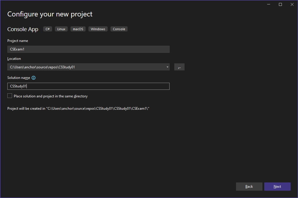 -o switch를 사용하면 두번째 project를 생성하기 위한 CSExam2 folder를 생성할 필요가 없습니다.