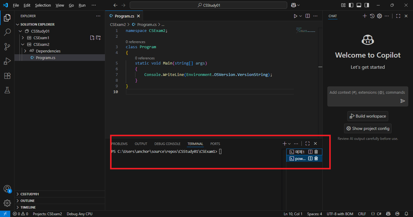 VSCode의 SOLUTION EXPLORER에서 CSStudy01 folder를 보면 CSExam2 folder가 추가되어 있음을 확인할 수 있는데 해당 folder를 확장하여 Program.cs file을 열고 그 안에 저장된 Main함수를 확인합니다. 그리고 해당 file을 VS2022예제와 마찬가지로 아래와 같이 변경합니다.