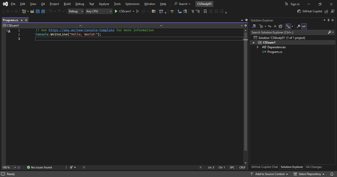 VSCode의 SOLUTION EXPLORER에서 기본적으로 열려있는 CSSTUDY01 folder를 접고 하단에 SOLUTION EXPLORER를 mouse를 통해 맨 위로 끌어올린 후 CSStudy01 -> CSExam1 folder순으로 확장하여 표시되는 Program.cs를 선택해 해당 file을 열어봅니다.