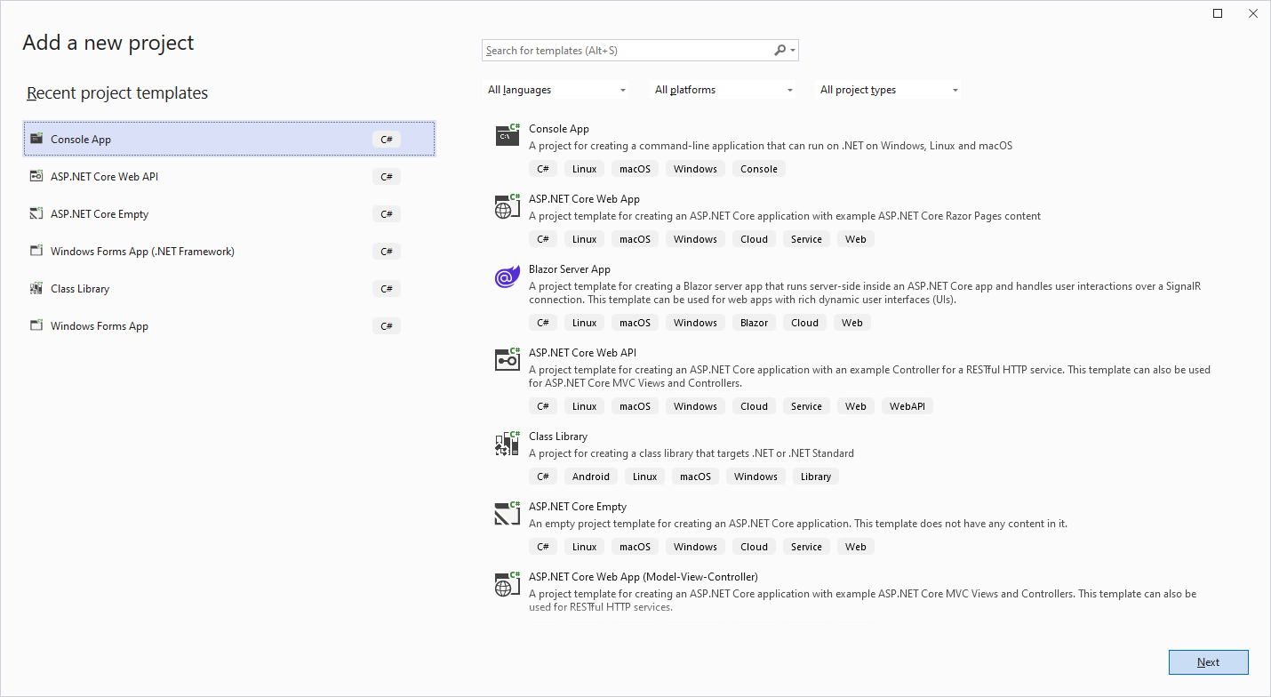 Microsoft Visual Studio 2022 for Windows는 console app, website, web service, desktop및 mobile app 등 대부분 형태의 application을 생성할 수 있습니다. Visual Studio 2022 for Windows를 cross-platform mobile app작성을 위해 Xamarin확장 기능을 사용할 수 있지만 macOS의 compile에서는 여전히 Xcode가 필요합니다.