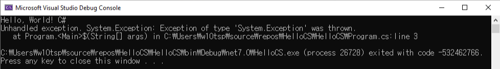 다시 Program.cs에서 아래와 같이 예외를 일으키는 구문을 추가하고