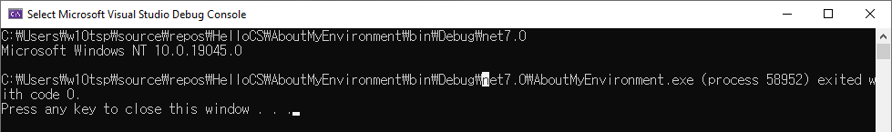 Visual Studio의 Solution Explorer에서 AboutMyEnvironment project에 mouse오른쪽 button을 click한뒤 'Set Startup Project'를 선택합니다. 그러면 해당 project의 이름이 진하게 변경되면서 해당 project가 시작 project로 설정되었음을 표시하게 됩니다. 이제 Debug/Start Without Debugging menu를 사용해 AboutMyEnvironment project를 실행하면 다음과 같은 결과를 볼 수 있습니다.