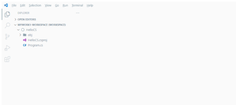 다시 Visual Studio Code에서 'File/Add Foler to Workspace...'을 선택하고 해당 folder안에서 'HelloCS'이름의 folder를 생성한 뒤 해당 folder를 선택하고 하단의 'Add' button을 눌러줍니다. 그러면 Visual Studio Code의 해당 workspace에 지정한 folder가 추가되어 있음을 알 수 있습니다.(다른 file이나 folder를 신뢰할 것인지 묻는 화면이 나올 수 있습니다. 그런 경우 'Yes'를 선택해 줍니다.)