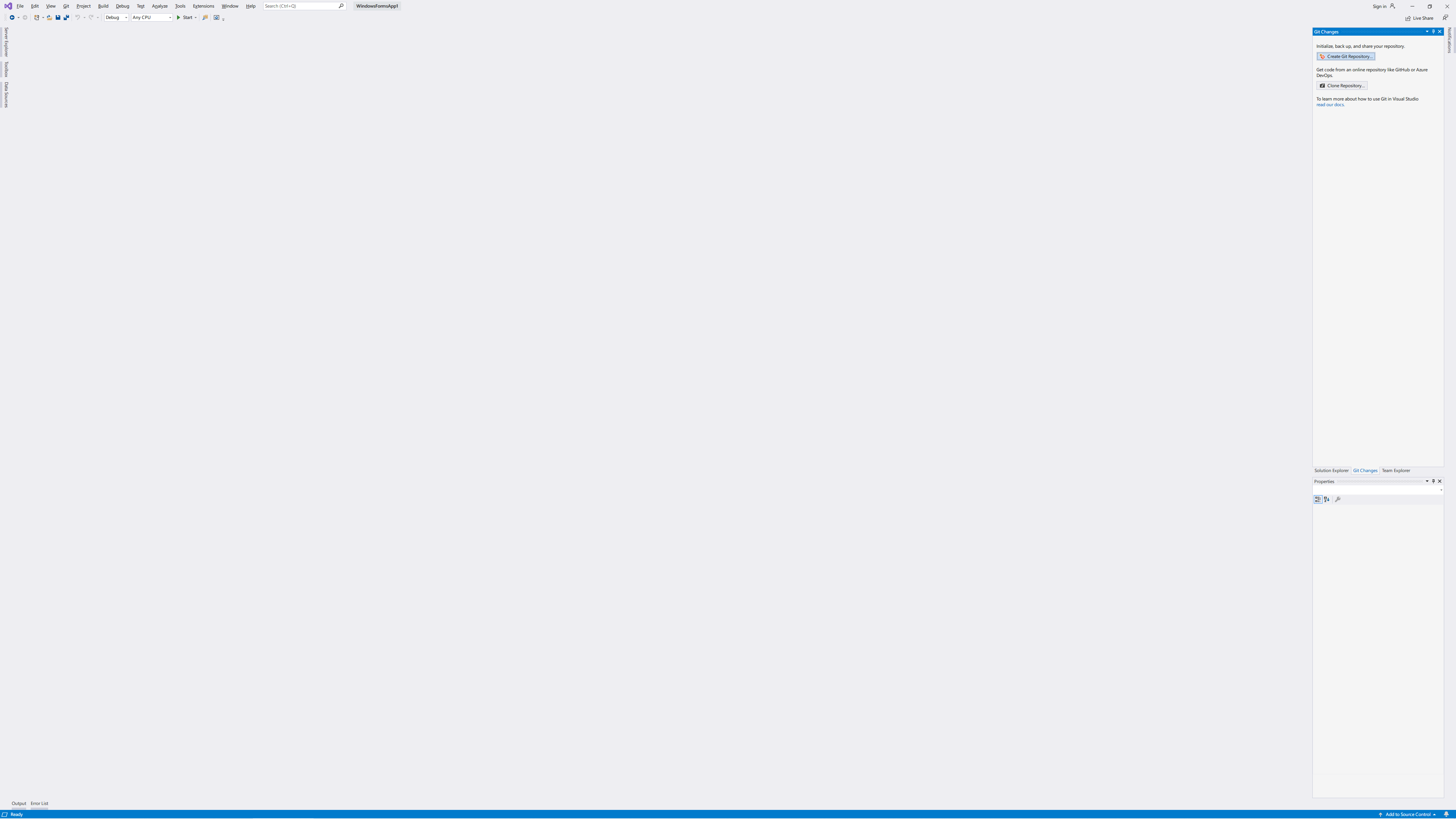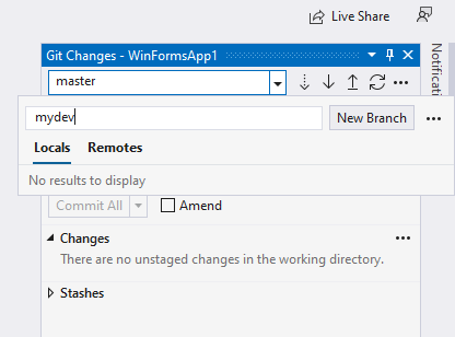 임의의 프로젝트를 생성하고 Team Explorer에서 Open Git Changes를 클릭하여 Git Change로 들어옵니다.
