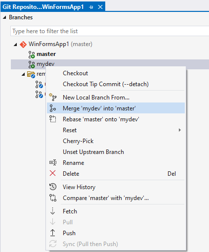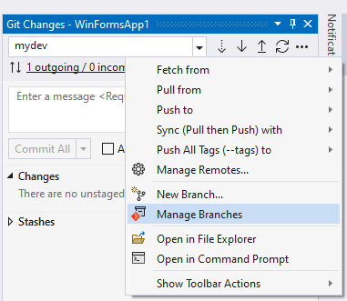 예를 들어 새롭게 만든 mydev라는 Branch에서 소스를 변경한 경우 이것을 원본격인 master로 병합시키려면 우선 Git에서 Manage Branches를 선택하고