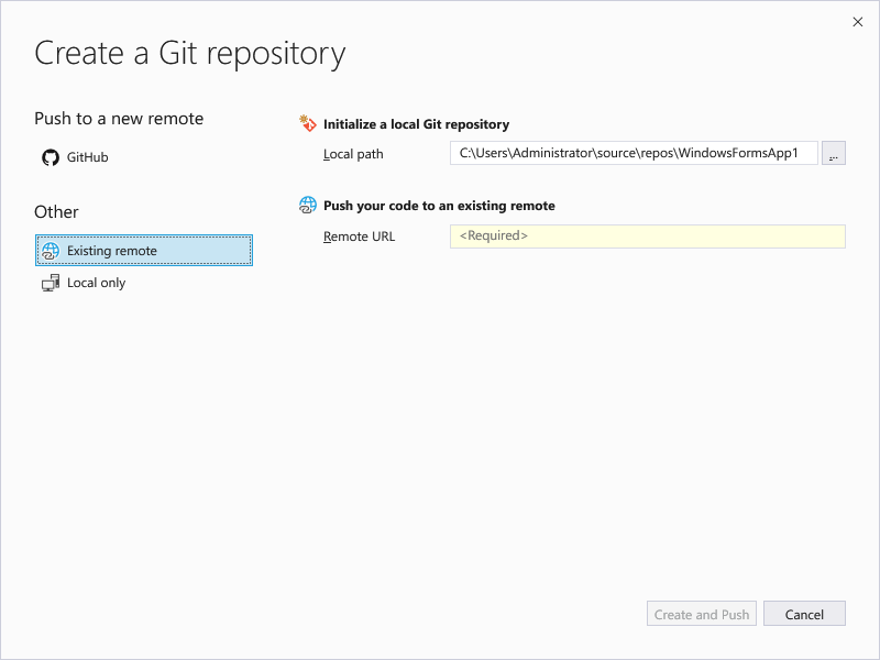 Create git Repository를 클릭하고 이어지는 화면에서 Existing Remote를 선택합니다.