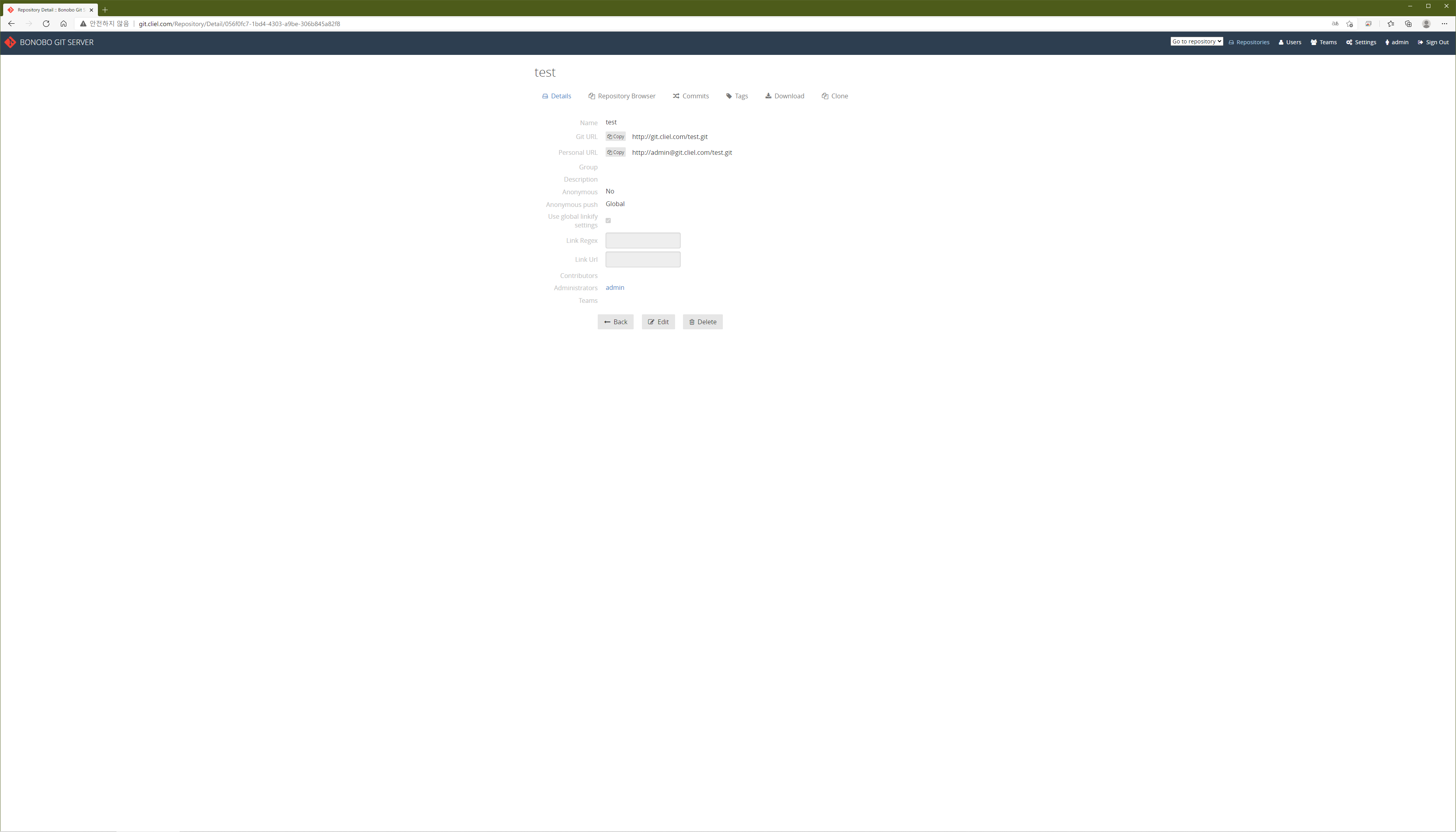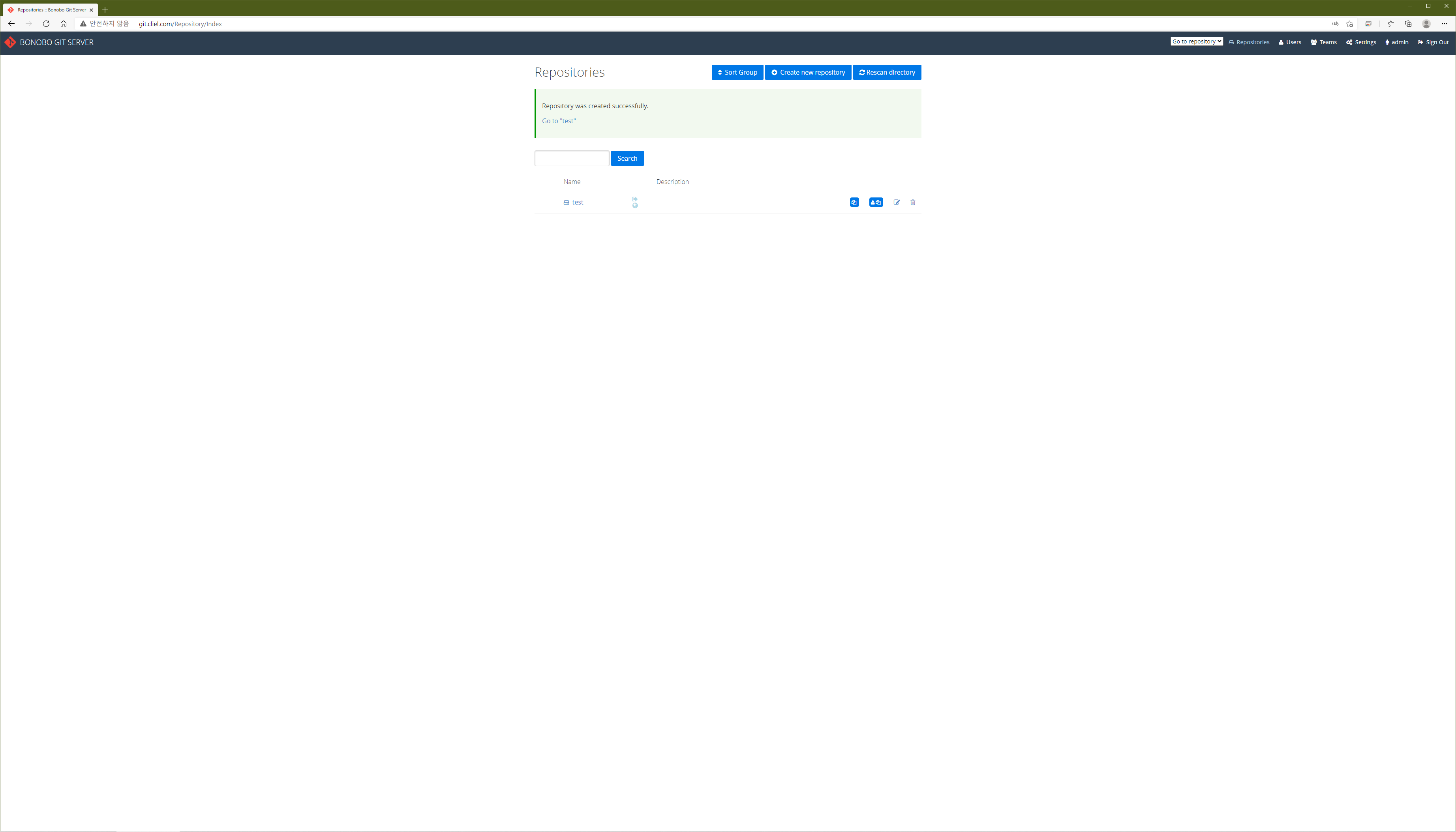 기본 계정은 admin/admin입니다. 해당 계정으로 로그인한 뒤 'Create new Repository'를 클릭해 새로운 소스코드 저장소를 생성합니다.
