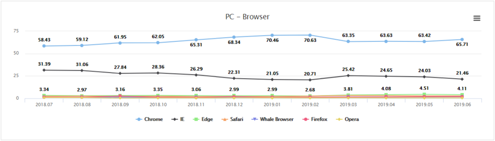 시간이 지나면서 익스플로러외에 다른 브라우저의 발전속도가 빠르게 진행되면서 대한민국의 압도적인 익스플로러 점유율은 점차 내려가고 있습니다. 반면 크롬의 점유율은 점차 향상되고 있는중이죠.
