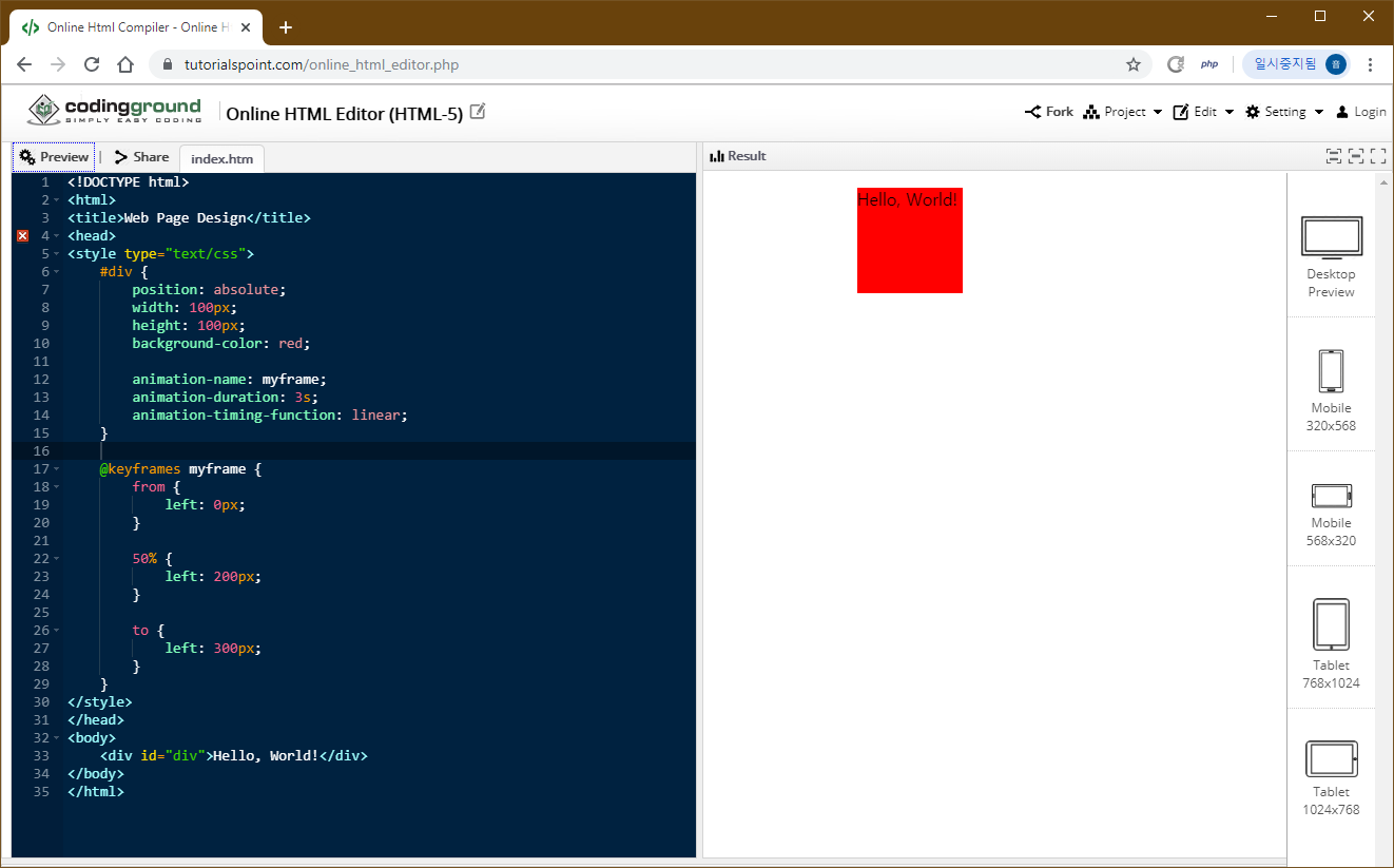 이렇게 작성한뒤 실행해보면 div가 왼쪽에서 오른쪽으로 이동하는 것을 확인할 수 있습니다.