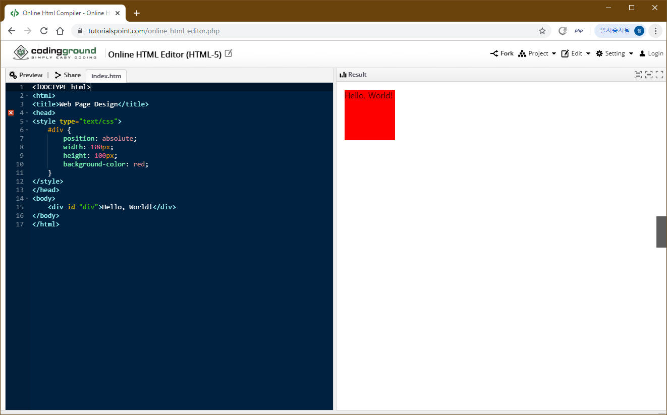 이를 이용해 div를 왼쪽에서 오른쪽으로 이동시키는 간단한 애니메이션을 구현해 볼 텐데 우선 다음과 같이 div를 생성하고 관련 스타일을 입혀줍니다.