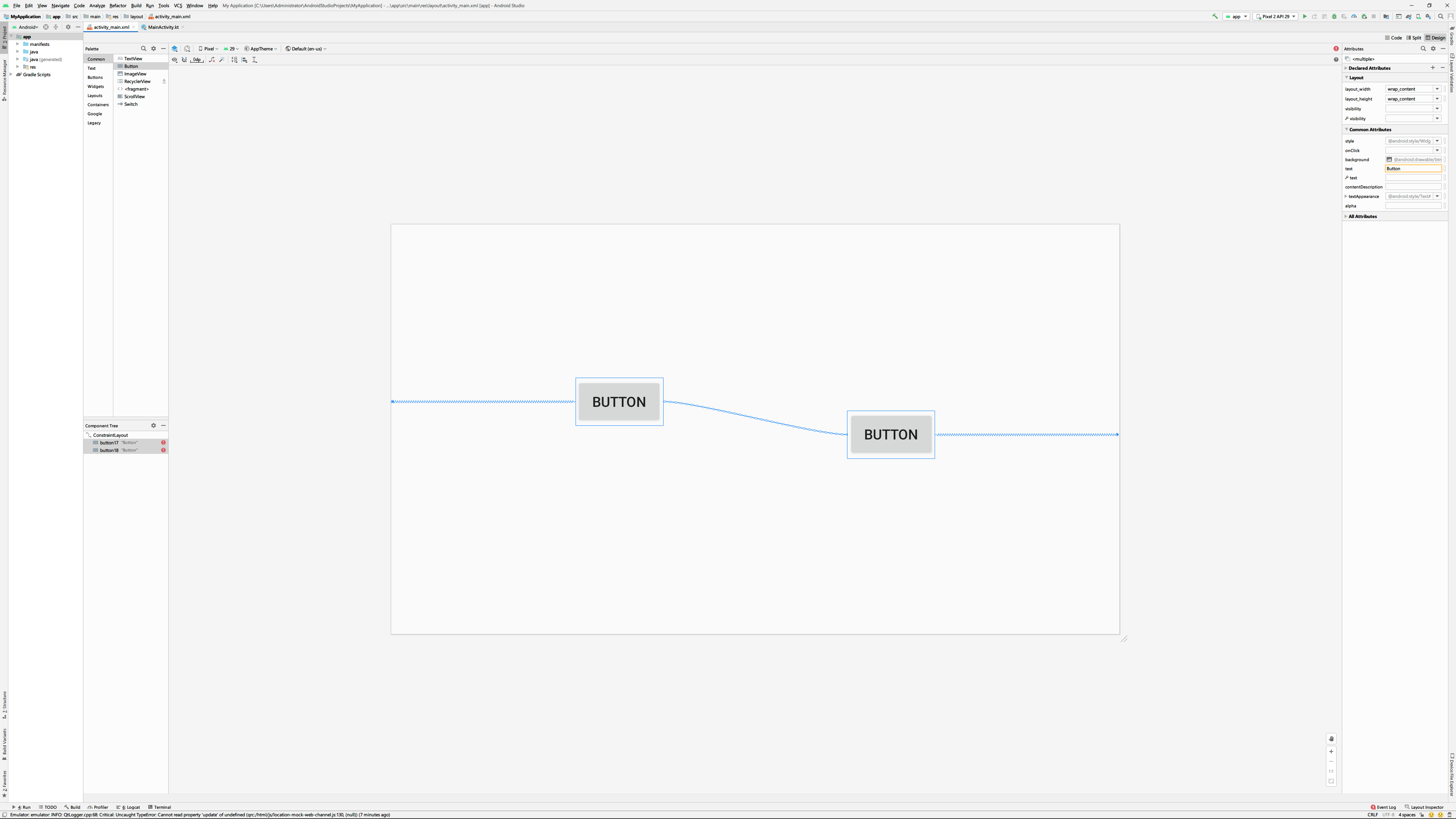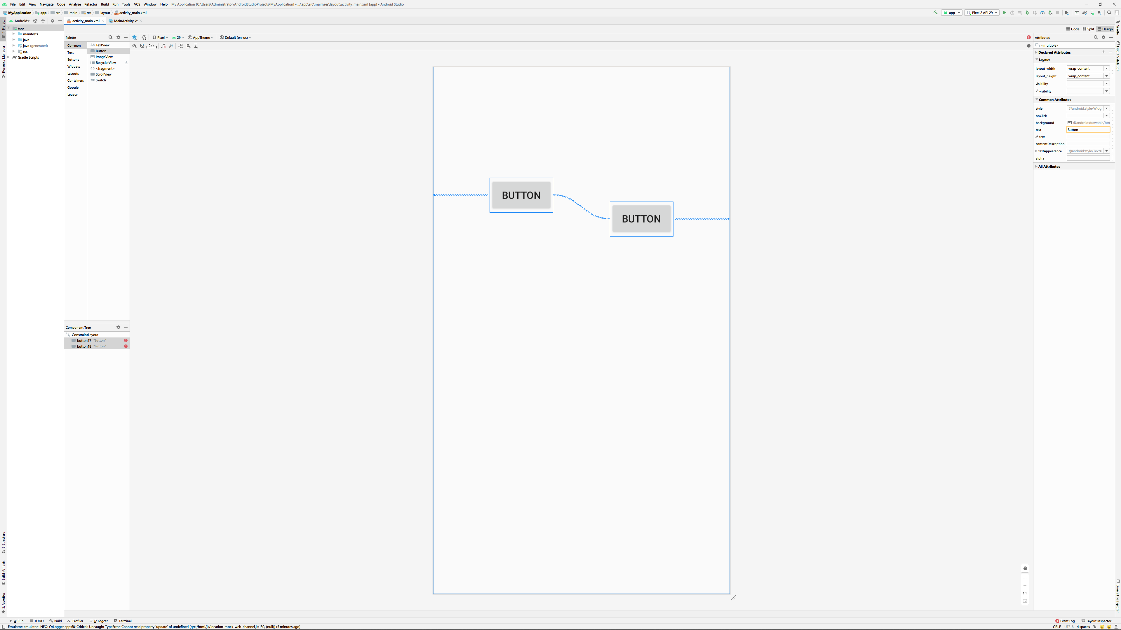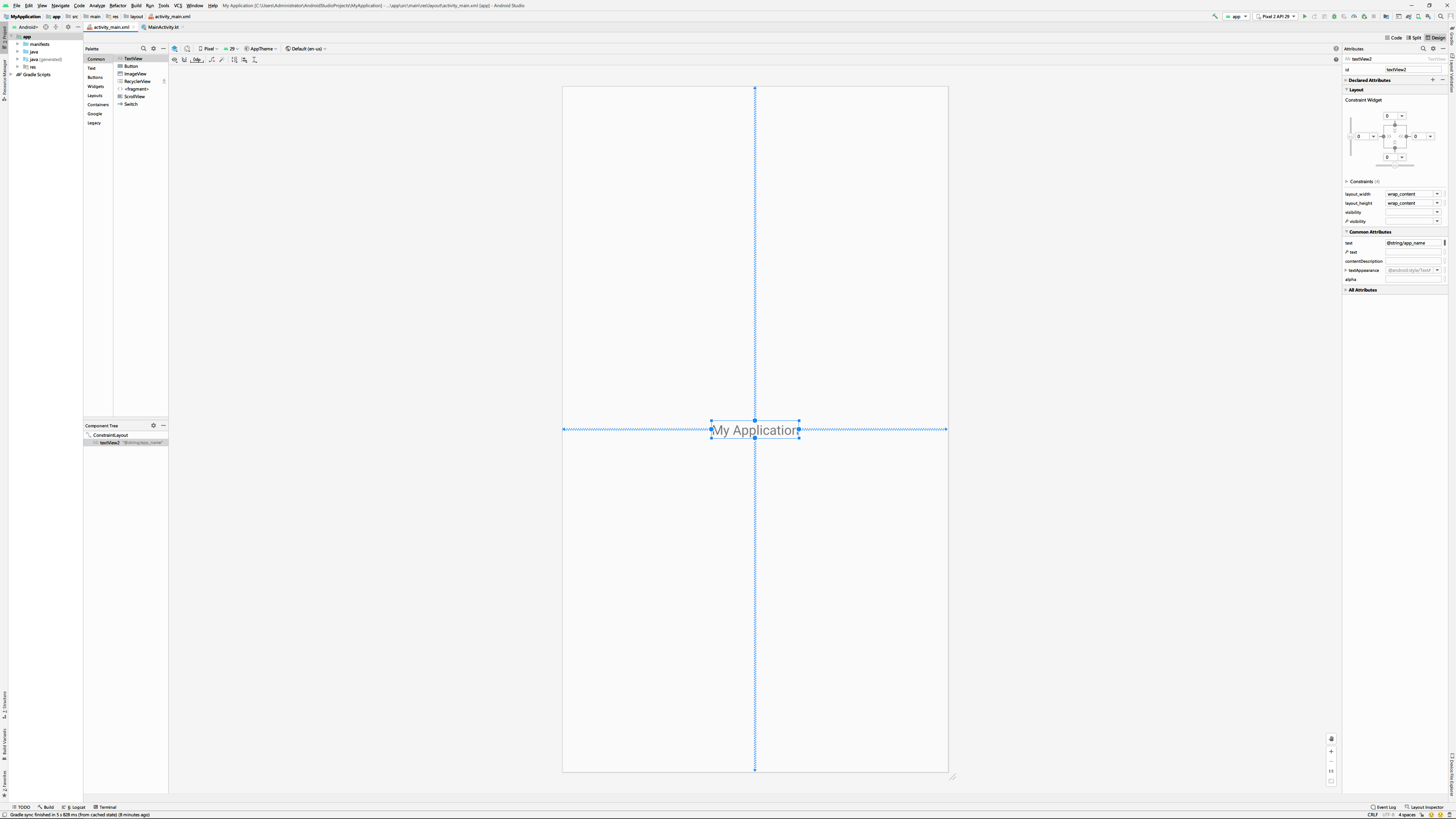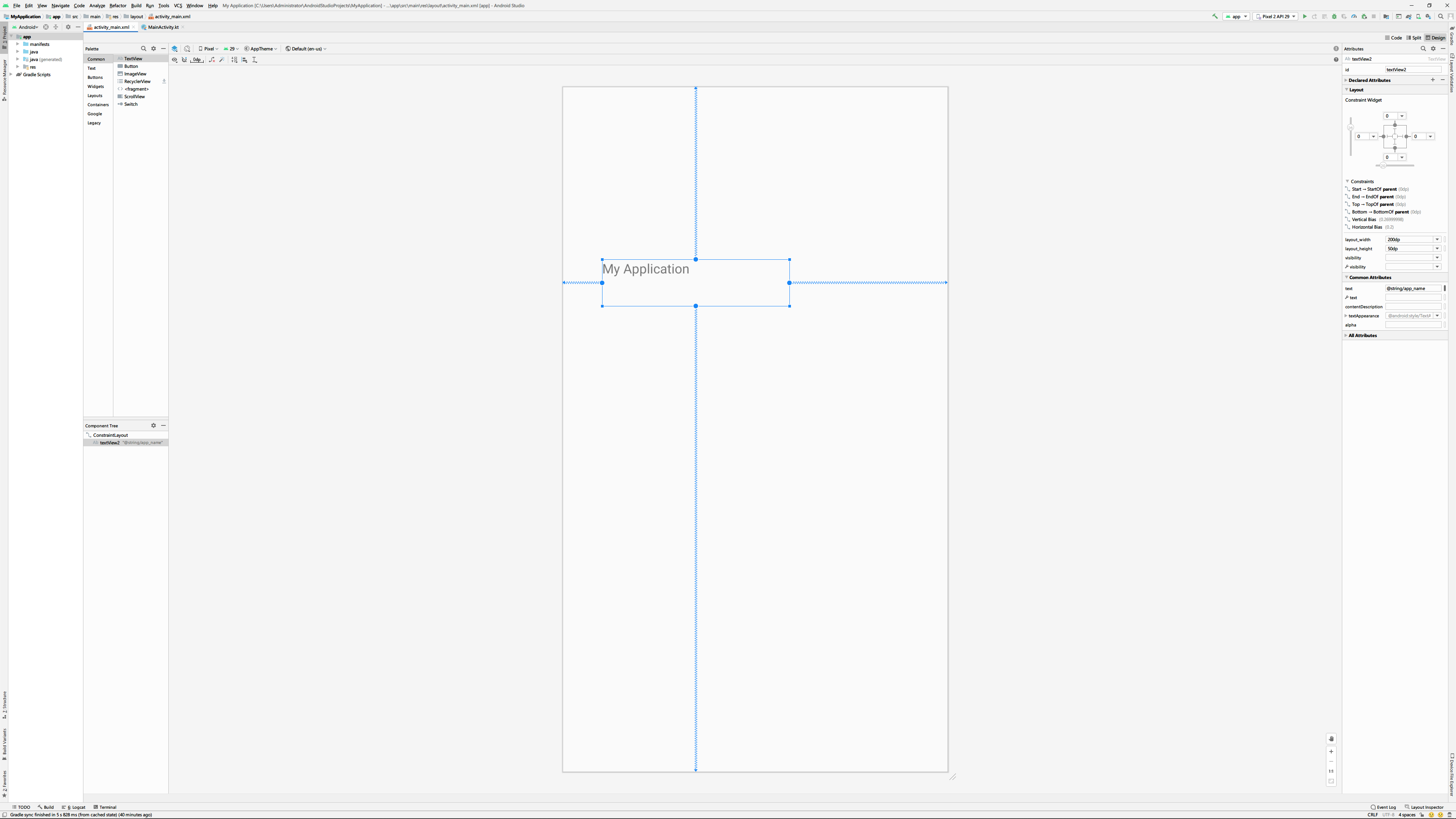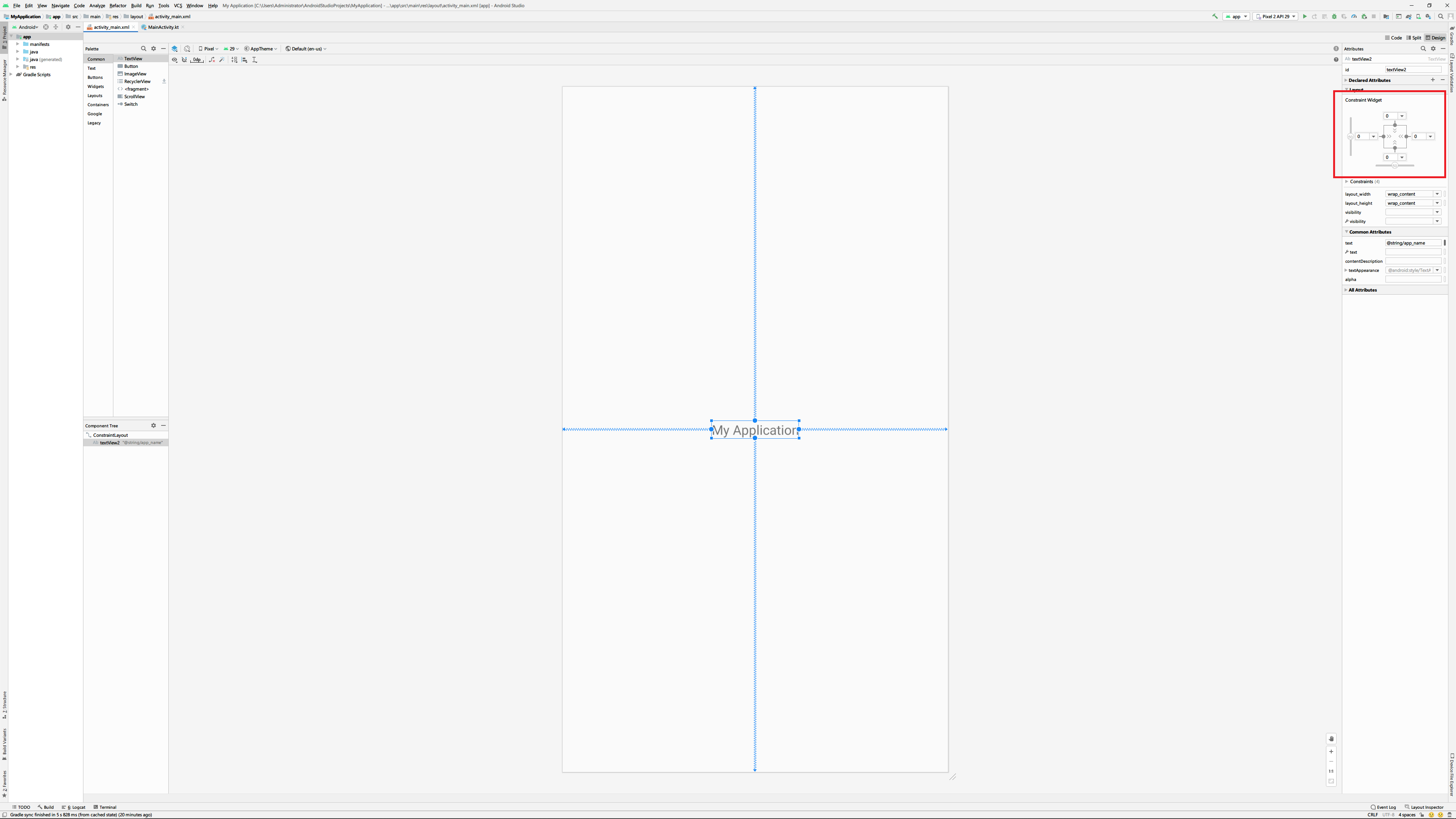 크기 조절기는 모양에 따라서 3가지 기능을 수행하는데 먼저 랩 컨텐트(wrap content)는 위젯의 크기를 위젯 내부의 내용에 맞추도록 합니다. 역기서 화면상의 위젯크기와 컨스트런트 설정창, 속성창을 유심히 봐주세요.