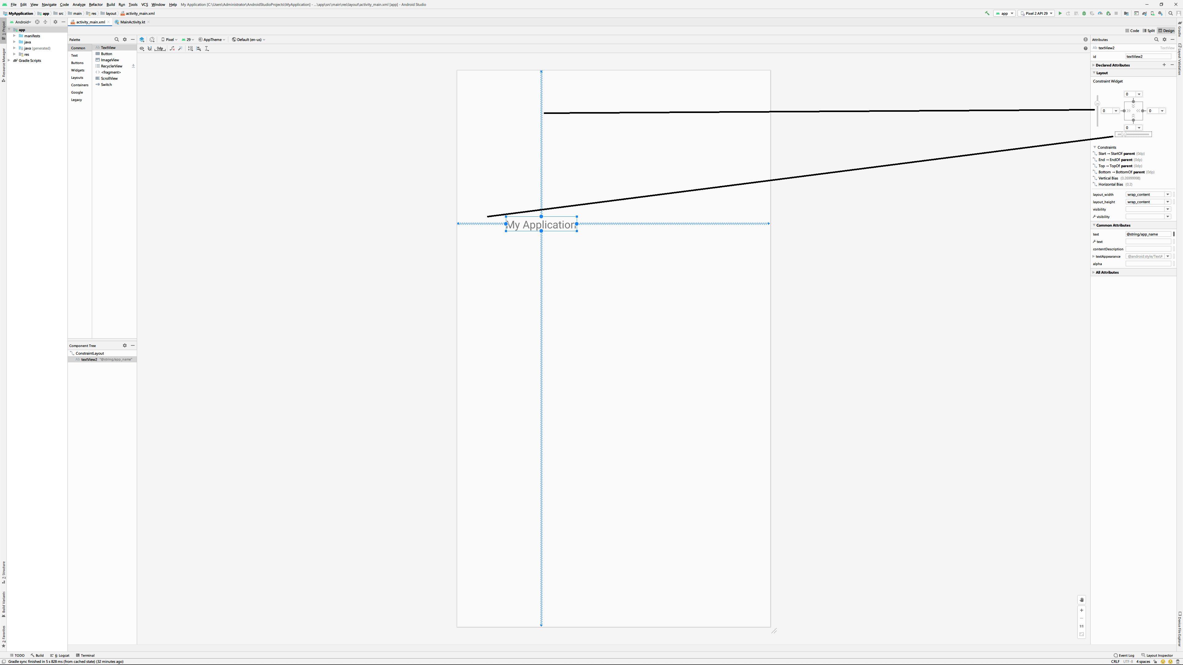 컨스트런트 레이아웃 방식은 Android Studio의 기본 레이아웃으로서 위젯을 컨스트런트의 설정을 통해서 구성하는 방식을 말합니다. 컨스트런트 방식에서 컴포넌트 트리 창에 있는 위젯을 선택하거나 아니면 디자인 화면에서 특정 위젯을 선택하면 위젯 좌, 우, 위, 아래에 다음과 같이 선이 나타나는 걸 볼 수 있습니다.