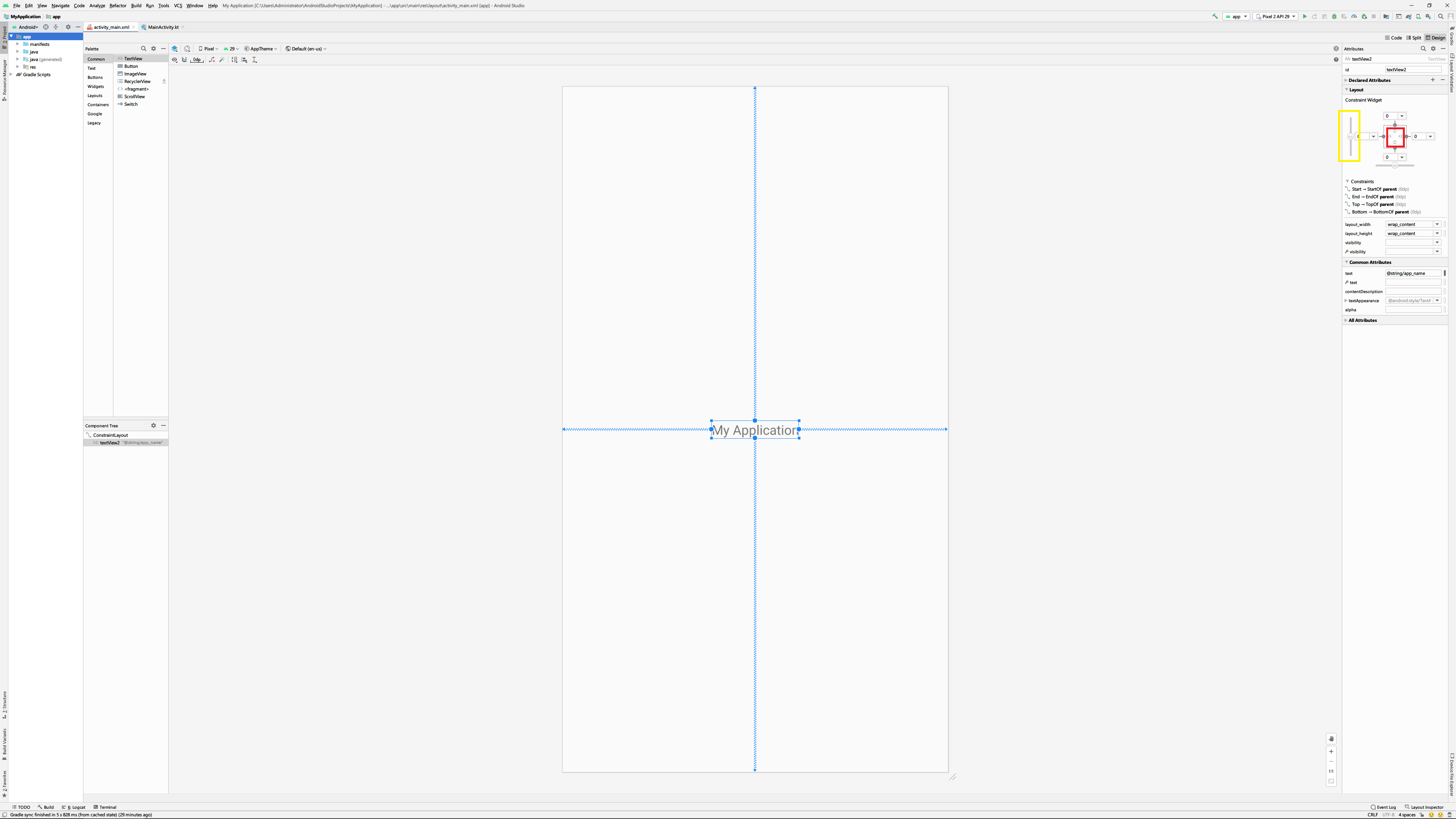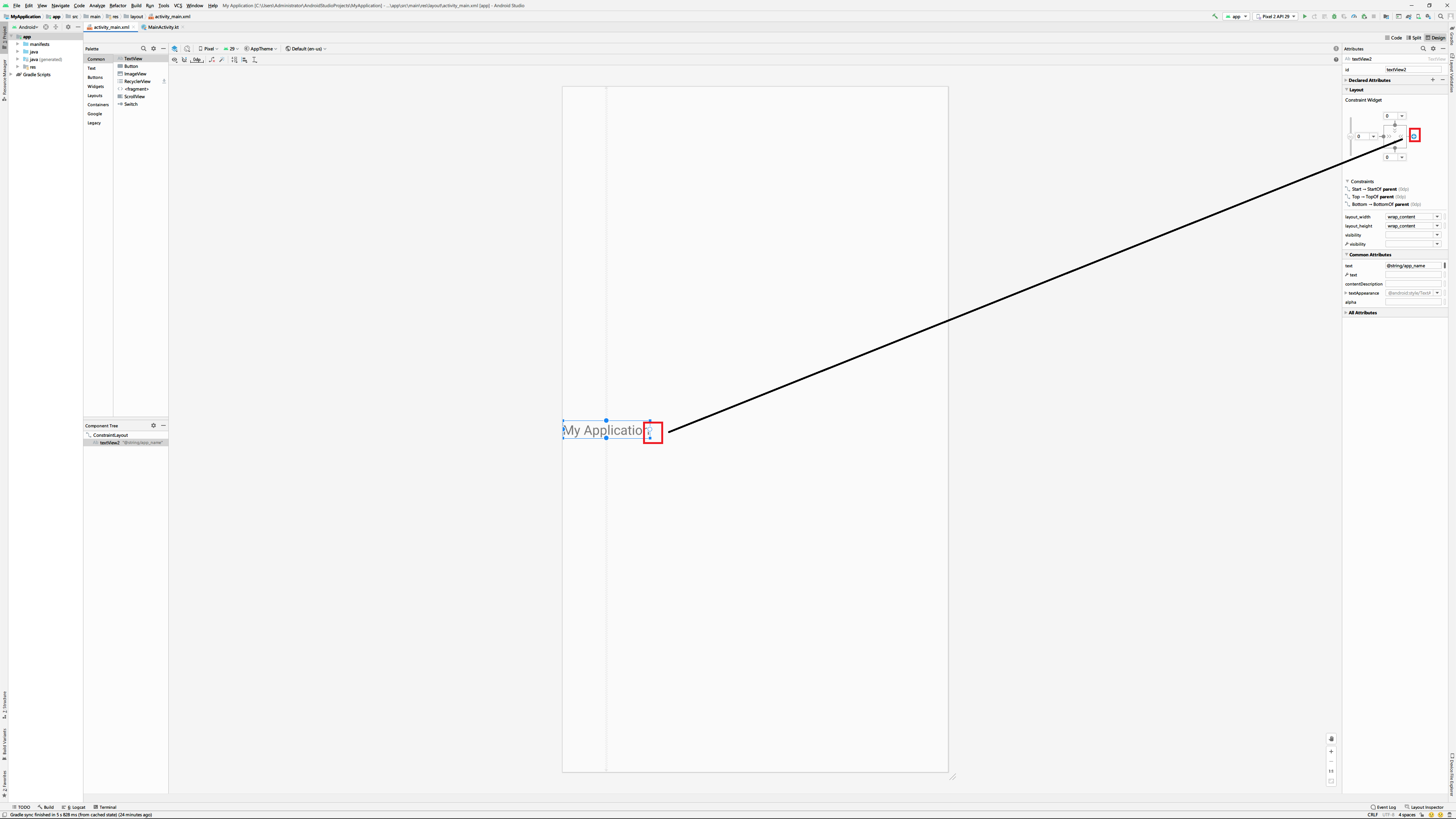 이 선을 컨스트레인트라고 하며 레이아웃이나 다른 위젯과의 연결 상태를 나타냅니다. 또한 컨스트레인트와 위젯이 만나는 지점의 동근 모양은 핸들러(붉은색)라고 하며 컨스트레인트가 다른 위젯이나 레이아웃에 연결되어 있는 상대 지점을 앵커 포인트라고 합니다.