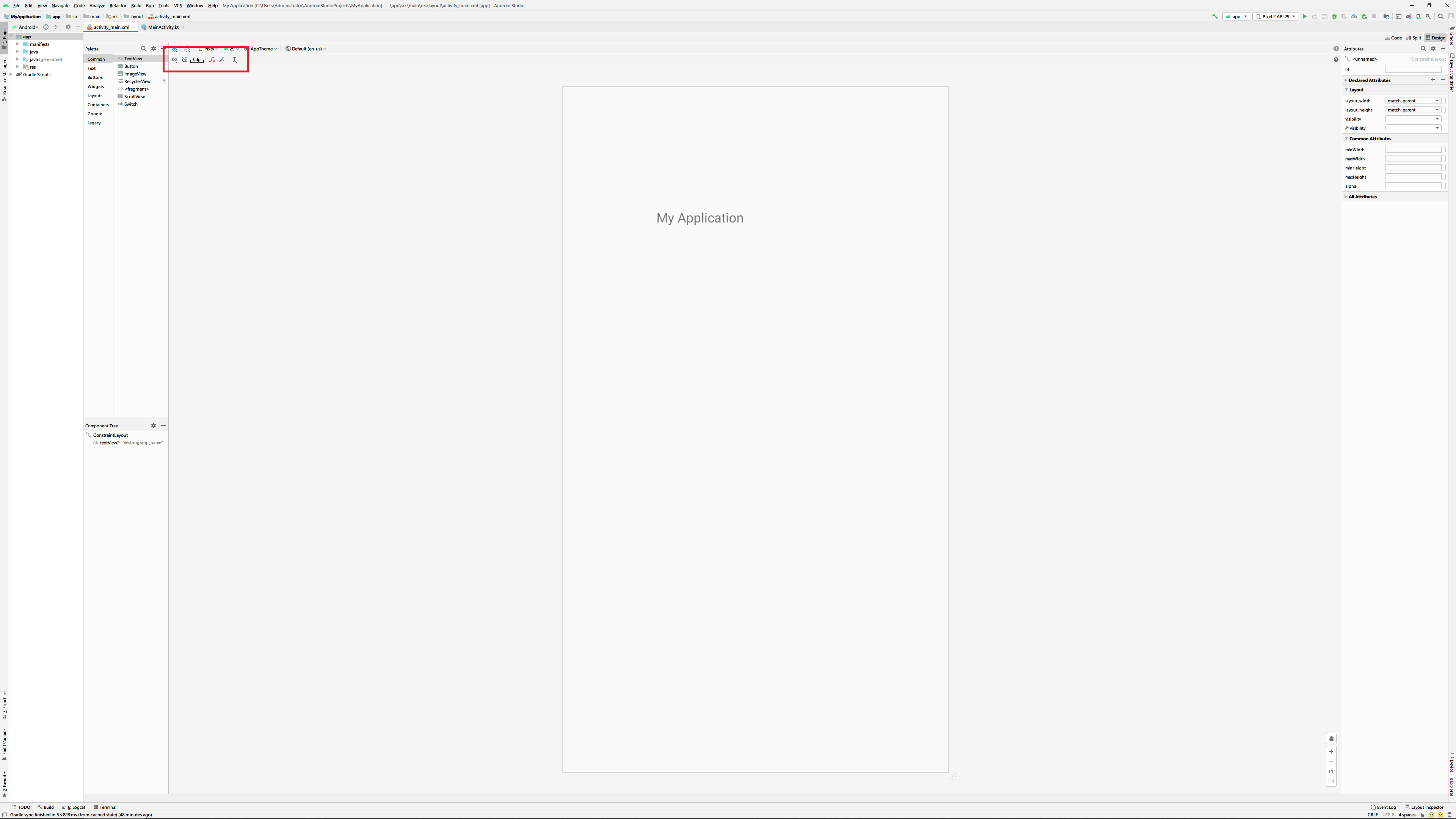 노란색 부분이 화면에 배치할 수 있는 여러가지 위젯과 위젯에 대한 속성을 지정할 수 있는 파란색 속성 창 그리고 현재 화면을 구성하기 위한 레이아웃 방식을 나타내는 붉은색의 컴포넌트 트리 창을 볼 수 있습니다.