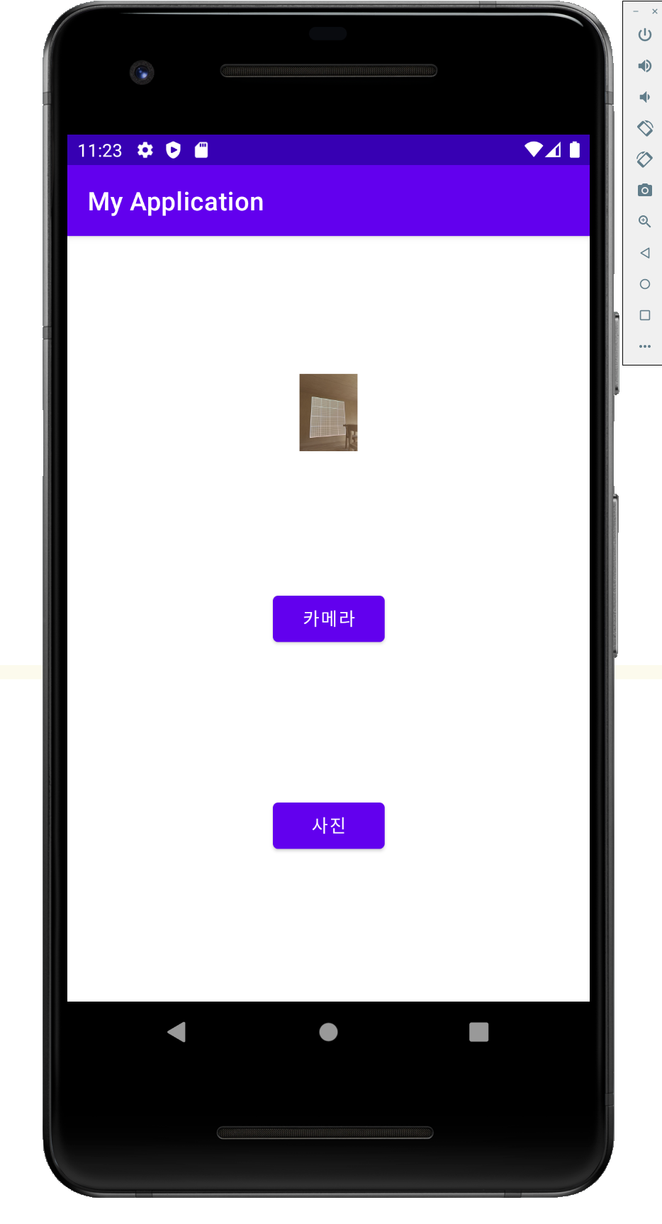 물론 위에서 처럼 저장된 사진을 가져올 수도 있습니다. 이를 확인해 보기 위해 Activity에 다음과 같이 버튼 하나를 추가합니다.