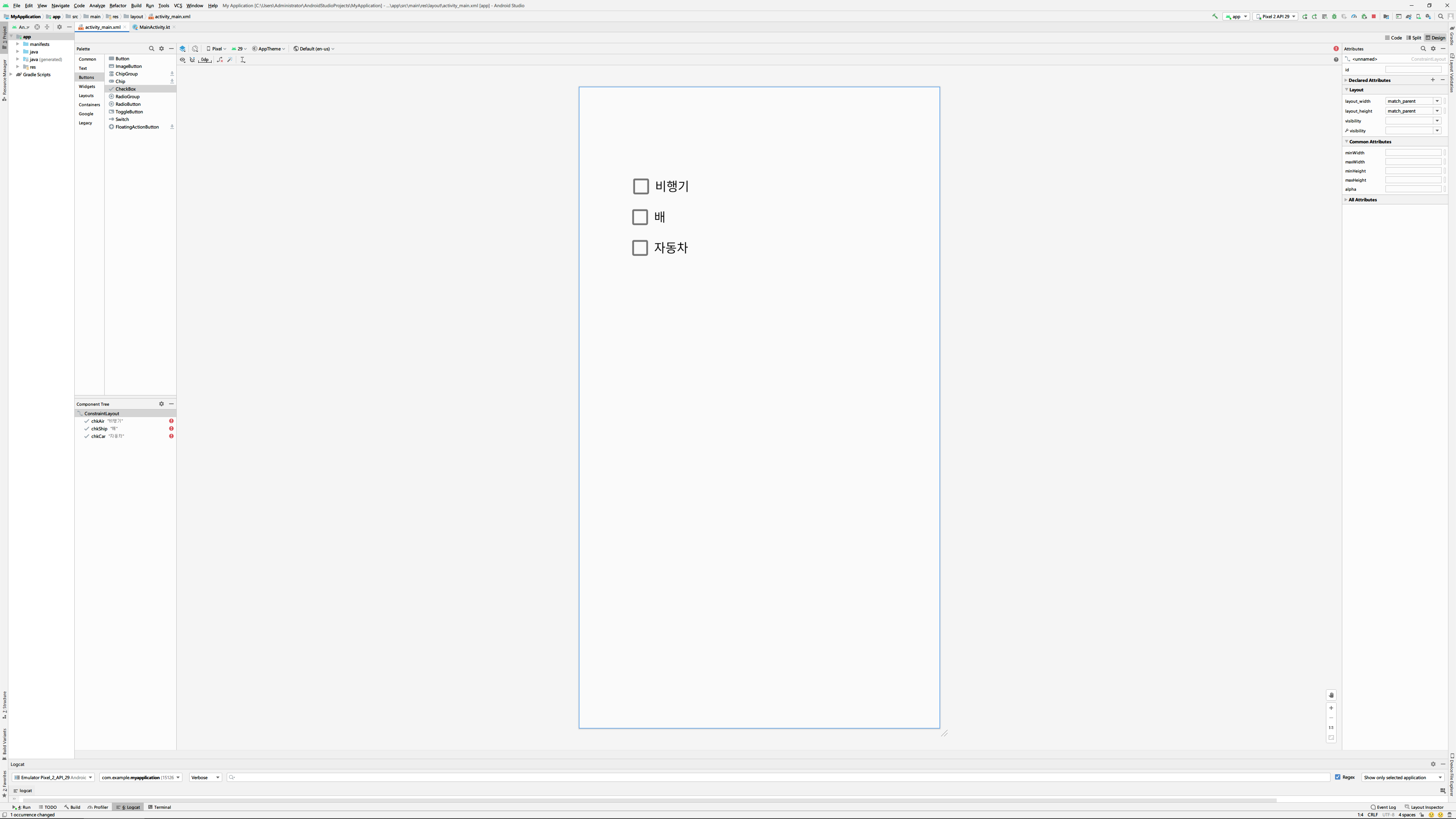 위에서 처럼 CheckBox를 배치한뒤 각각의 속성에서 ID는 chkAir, chkShip, chkCar로 변경하고 Text를 비행기, 배, 자동차로 변경합니다.